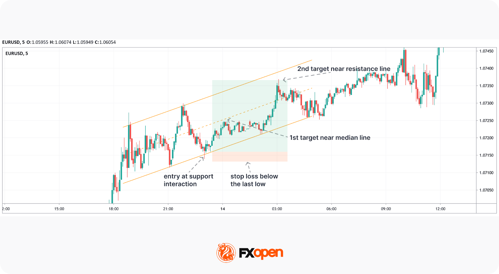 Profit targets might be set at the median line of the bullish channel pattern, as this represents a key level where the price often retraces. Some traders choose to trail their stop-losses as the price moves toward resistance or support, locking in the trade if the price continues in their favour. Alternatively, traders hold the position until the price touches the opposite boundary, maximising potential gains within the channel.