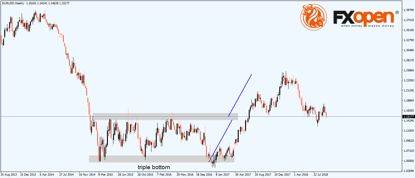Take the EURUSD pair, for instance. The recent triple bottom took over two-and-a-half years to form. Eventually, the market reversed, and the rally didn’t stall until the pair completed the measured move.