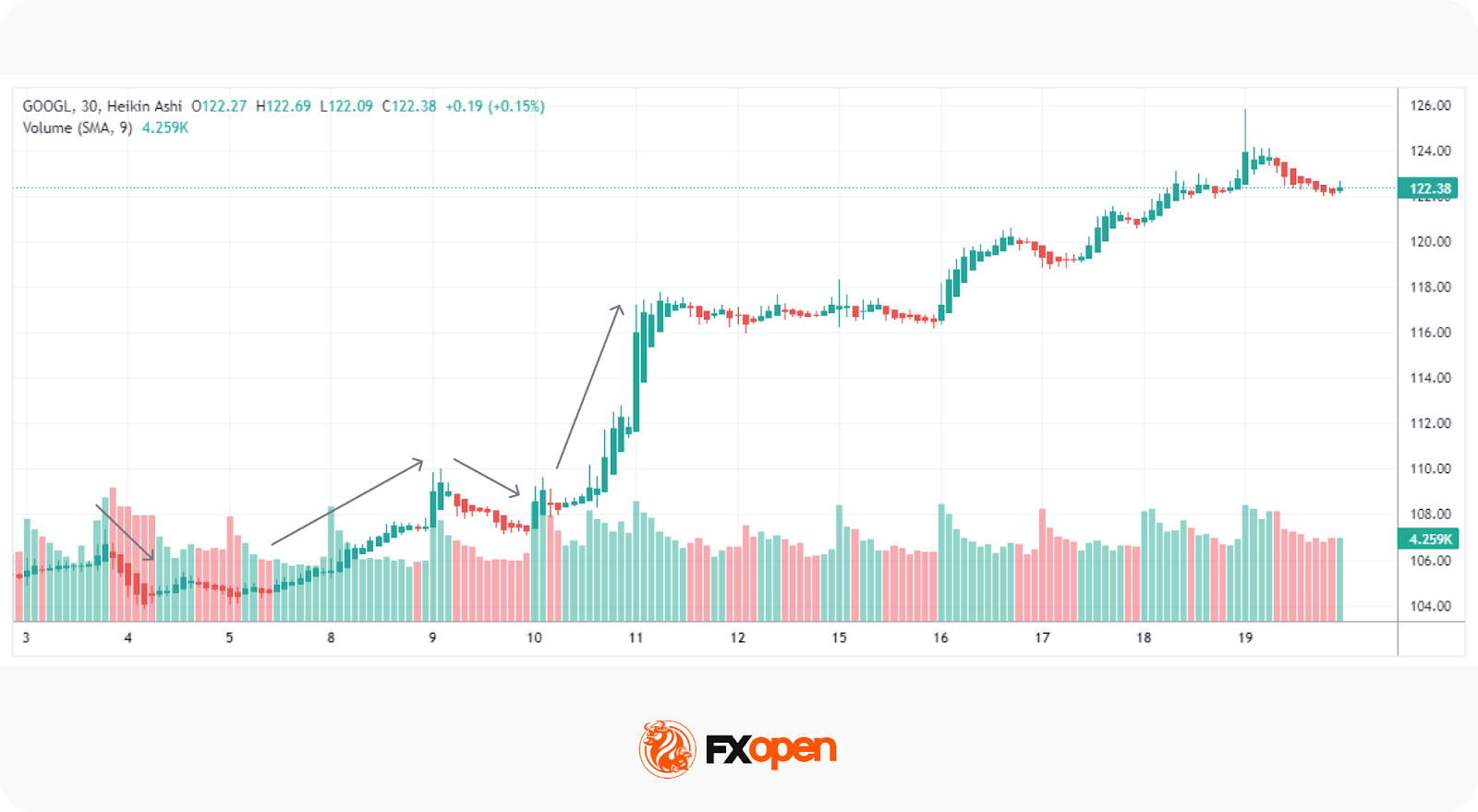 Heikin Ashi chart type shows trend strength through candle colour and size. Consecutive bullish candles with no lower shadows indicate a strong uptrend, while bearish candles without upper shadows suggest a strong downtrend. Small or doji-like candles may signal consolidation or a possible reversal.