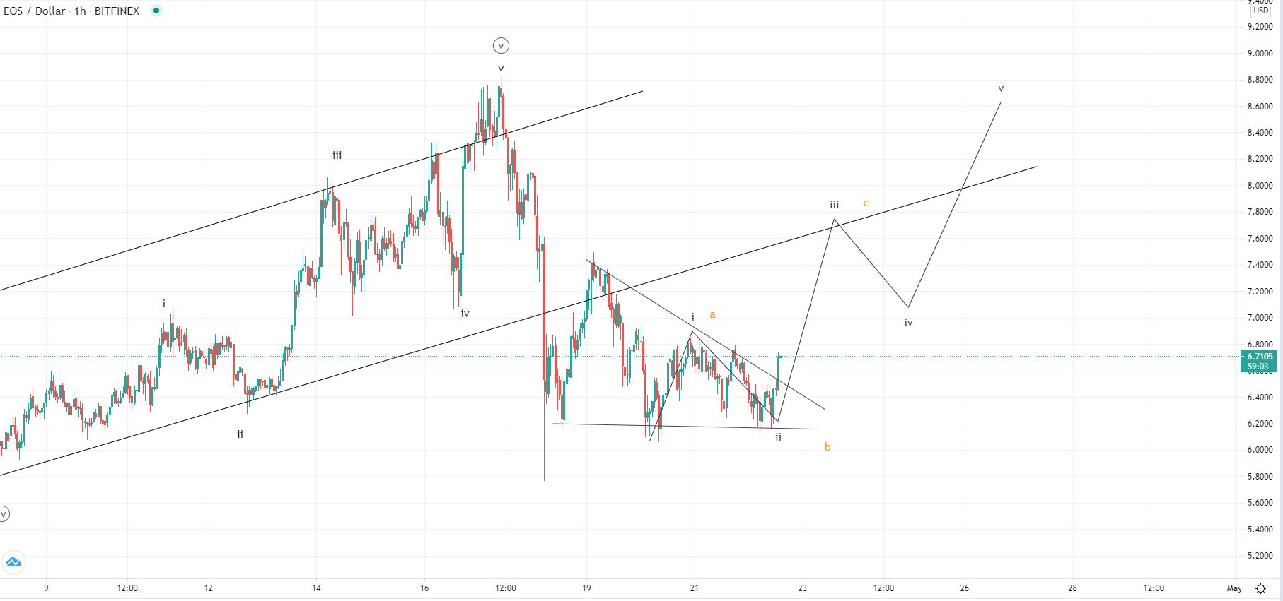 In a bullish scenario, we could have seen the completion of the descending move in which case we are seeing the start of the next impulse to the upside from Tuesday. In both cases, the price would now be expected to continue moving to the upside at least to the $7.8 area where the ascending trendline, previously serving as support is. If the price gets rejected from there and continues moving below the $6.8 area that would invalidate the possibility of a five-wave impulse, but if we see the price enter the territory of the upper range it would be a bullish sign.