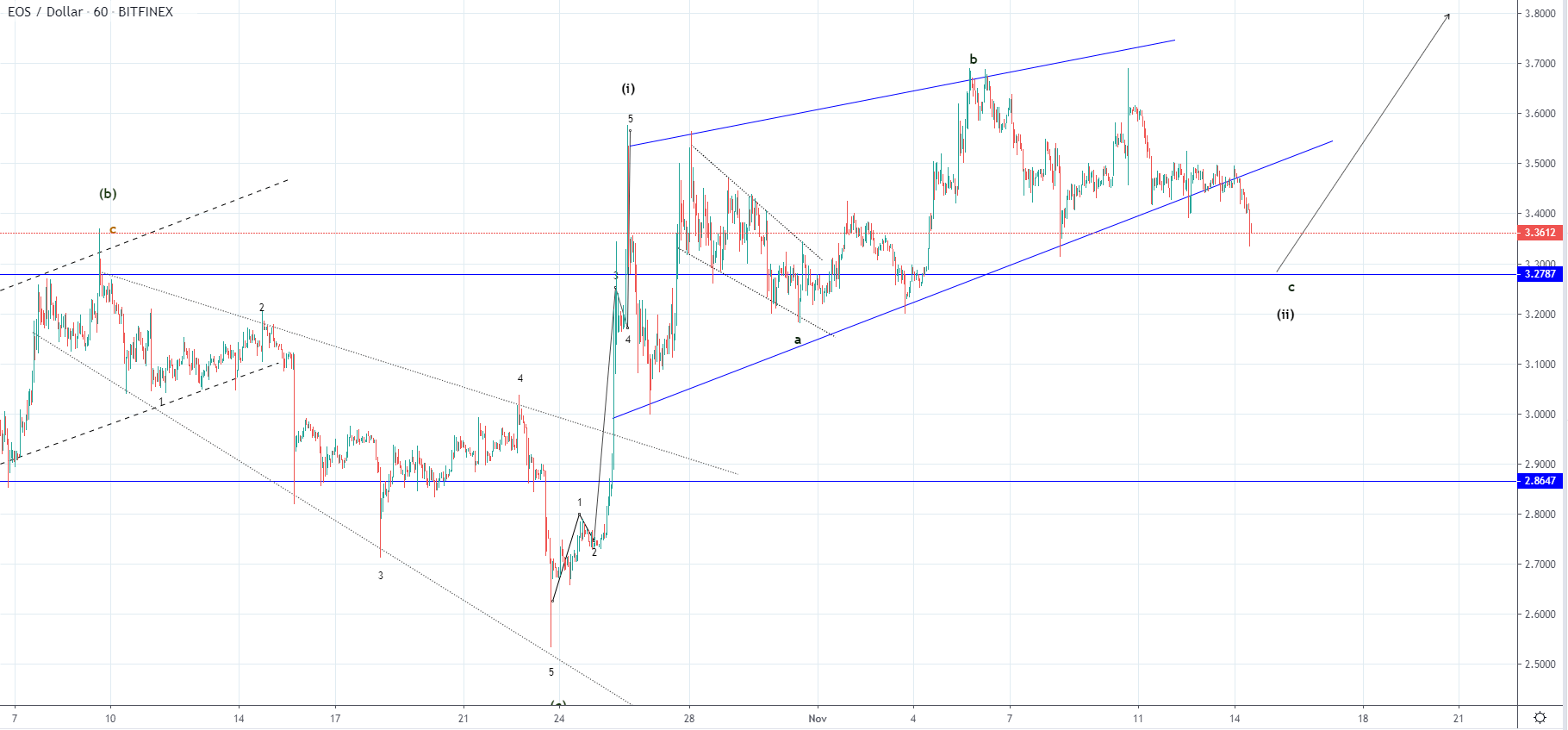 Similarly, as in the case of Litecoin, the price of EOS has also formed an ascending triangle after an impulsive increase and after reaching $3.61 on Sunday it started declining. The price decreased by 7.44% from there to the lowest point today at $3.34 around which the price is currently being traded and consequently made a breakout to the downside from the triangle.