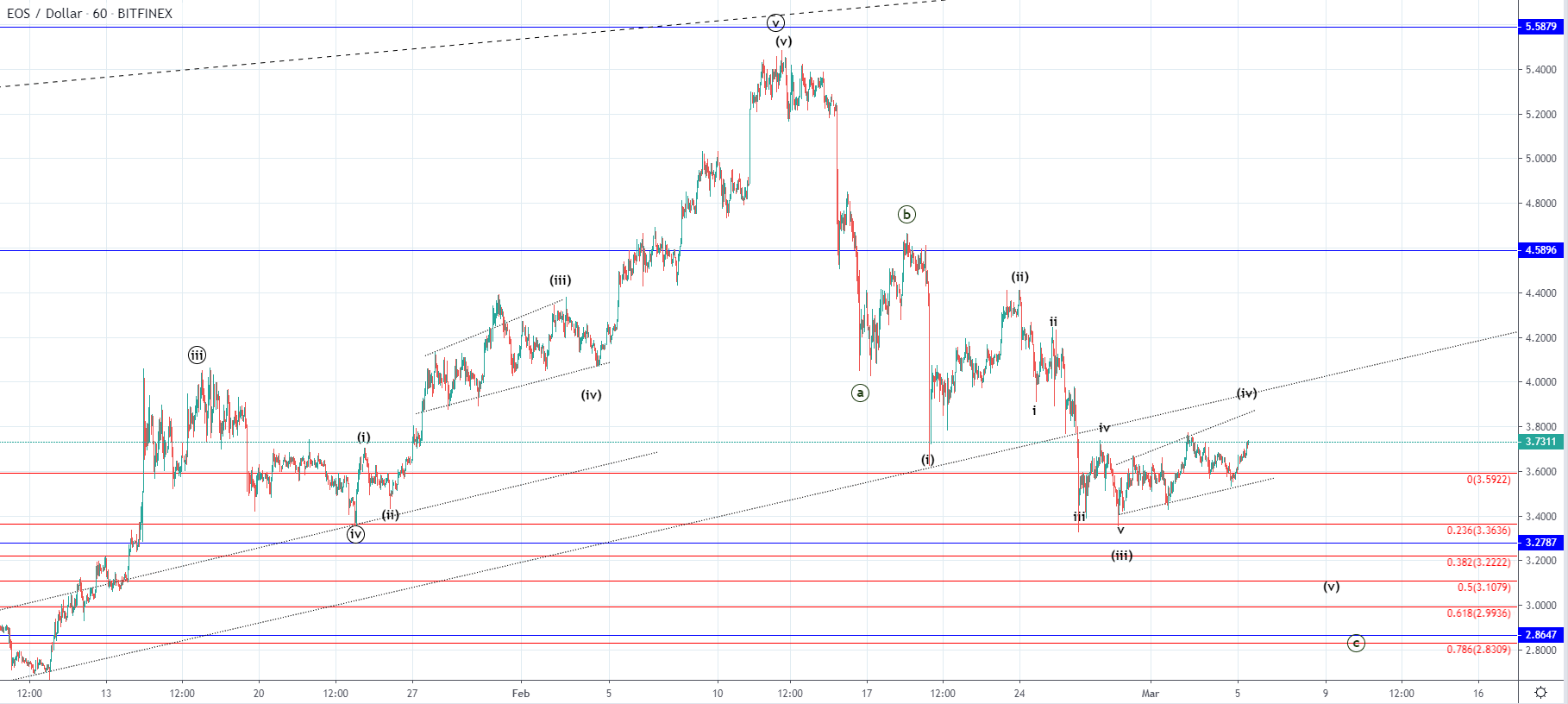 On the hourly chart, we can see that an ascending channel has started forming since the 28th of February when the price came down to $3.422 at it’s lowest point which was an interaction with the 0.236 Fibonacci level. This point could have been the ending point of the ABC correction to the downside like mentioned in the case of Litecoin, but on the chart of EOS, the wave structure implies likeliness to the alternative scenario in which we are seeing the development of the 4th wave from the C wave.