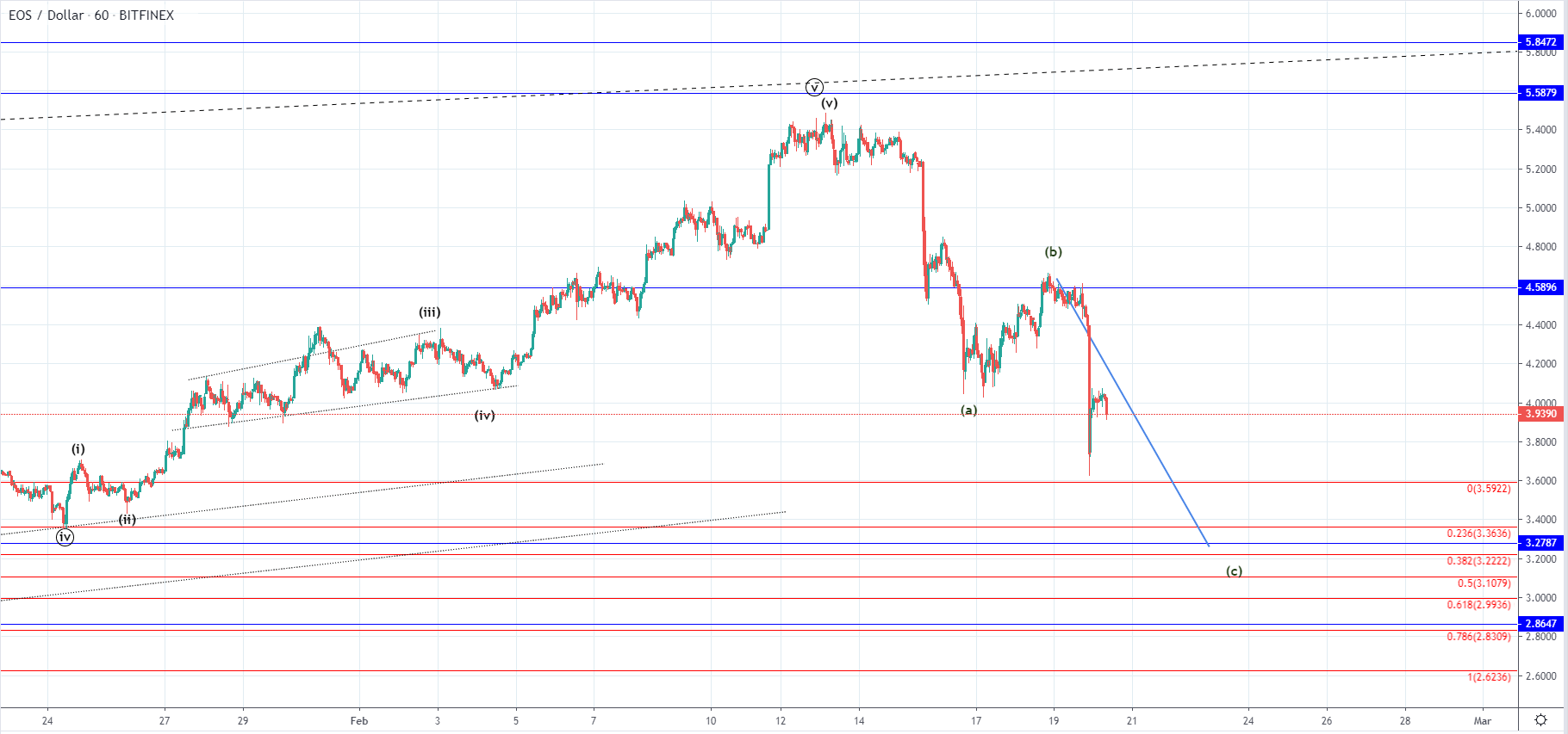 On the hourly chart, we can see that the price like in the case of Litecoin found support at the lower ascending trendline vicinity and came just above the 0 Fib level before it found support. The recovery that followed hasn’t made any major gains and is struggling to keep the price above $4.