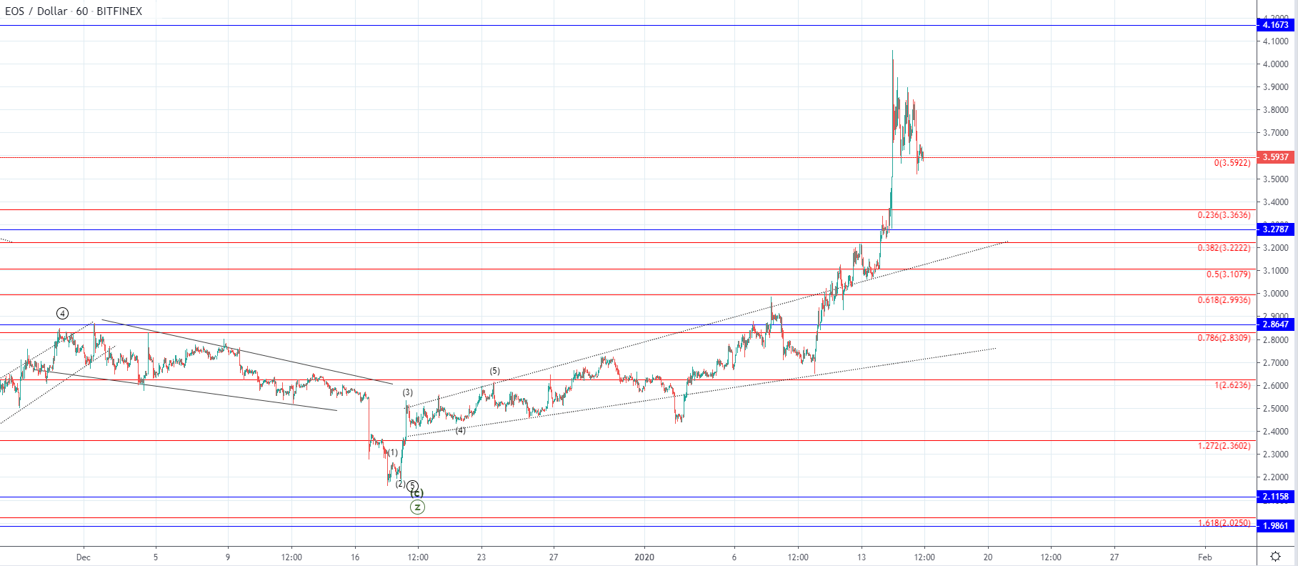 On the hourly chart, you can see that the price is currently being traded at $3.6 and is retesting the 0 Fib level for support which is the significant ending point of the upper range and serves as a pivot point. As the price spiked inside the territory of the upper range and managed to stay above the 0 Fibonacci line it could mean that further increase is highly probable but if the price falls below the mentioned level further decrease would look more likely.