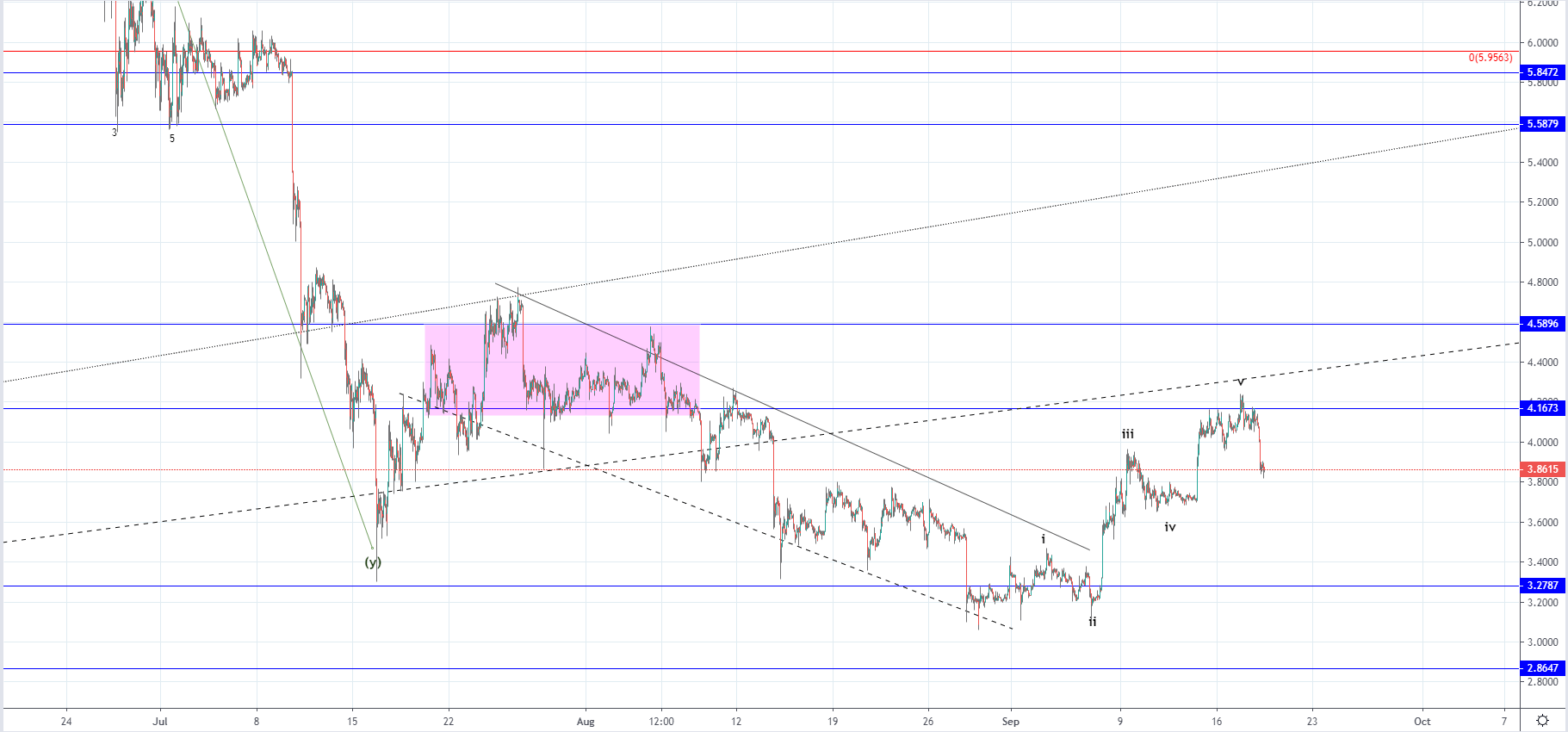 On the hourly chart, we can see that since the start of September the price has been moving to the upside and broke out from the descending channel. The price increase in a five-wave manner which is the first sign of impulsiveness but as the 5th wave ended we are now seeing the first retracement starting to develop to the downside. If this is the start of the higher degree recovery the price could now come down to the Septembers low and retest the $3.27 level before continuing its upward trajectory but it could very well find support on a higher level.