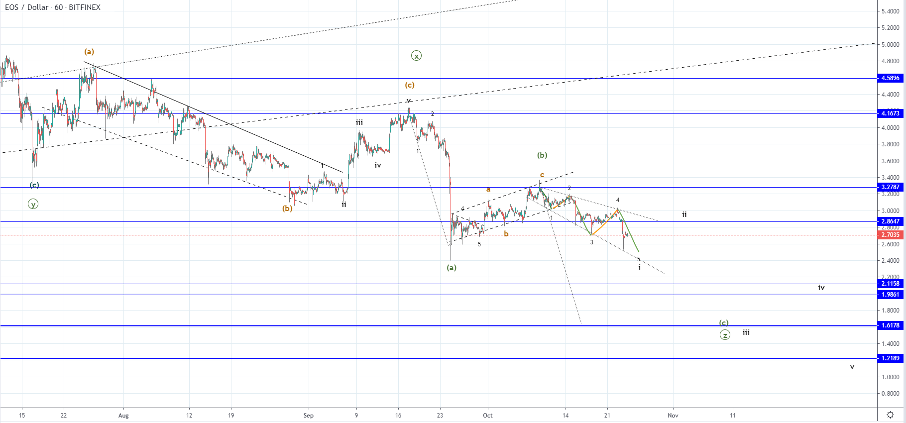 The price of EOS has decreased by 11.% from Monday’s high at $3 measured to today’s low at $2.6729 around which it is currently being traded. Looking at the hourly chart below you can see that the price was been decreasing in a five-wave manner from the rejection at the $3.2787 horizontal level and has formed a diagonal which could be the one of a leading kind which would be the first wave off of the higher degree five-wave move to the downside.