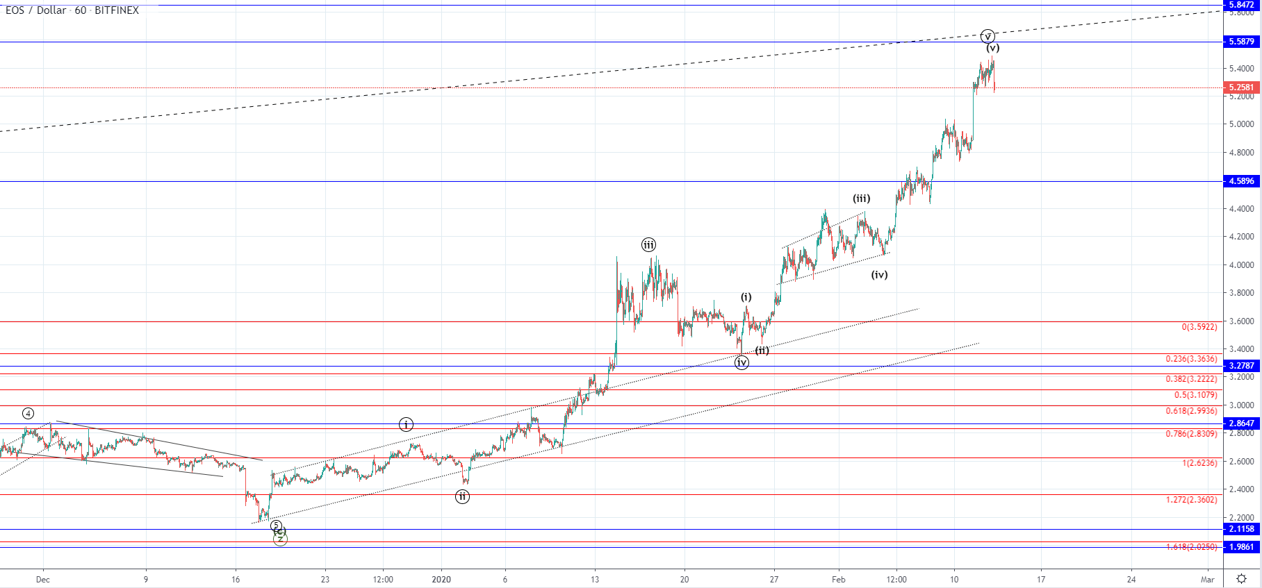 If the 5th wave has been completed the price is now set to begin the correction of a higher degree which can push the price of EOS significantly lower, but there isn’t been much indication that the move started which is why we could see further retest of the upper resistance levels before this expected downturn.