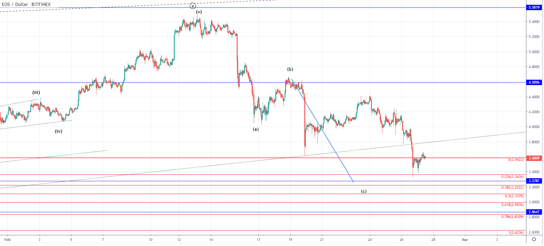 The price of EOS has also been decreasing impulsively from Mondays open at $4.41 which is it’s highest point of the week at $3.42, made today. This decrease of 22.44% has starting to look like completed as a minor recovery has been made with the price currently being traded at $3.57
