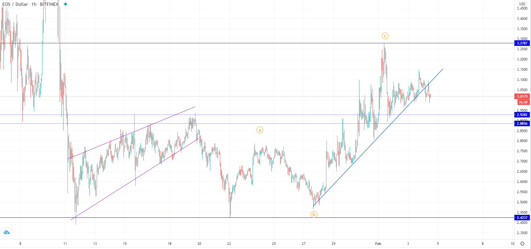 As you can see from the hourly chart the price made a breakout below its ascending trendline that dates from the 27th of January. This ascending trendline is the 3rd wave from the upward move that starts on the 22nd of January, but it is still unclear whether or not it is an impulse or a corrective count. Judging by the wave personality it looks more corrective at this point which is why I’ve labeled it as an ABC. This is soon going to be validated as if the price continued moving to the downside below the $2.88 zone it could very well mean that we have seen the correctional ABC count.