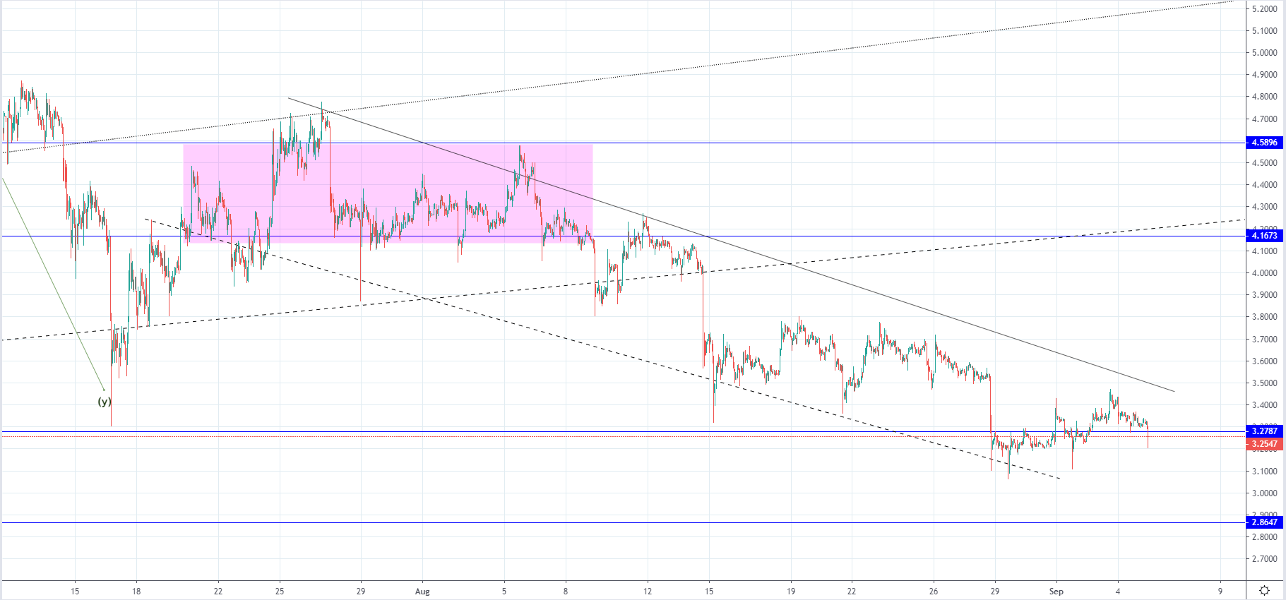If the price doesn’t find support and starts moving to the downside again the next potential target for the expected decrease would be the lower horizontal support level at $2.86.