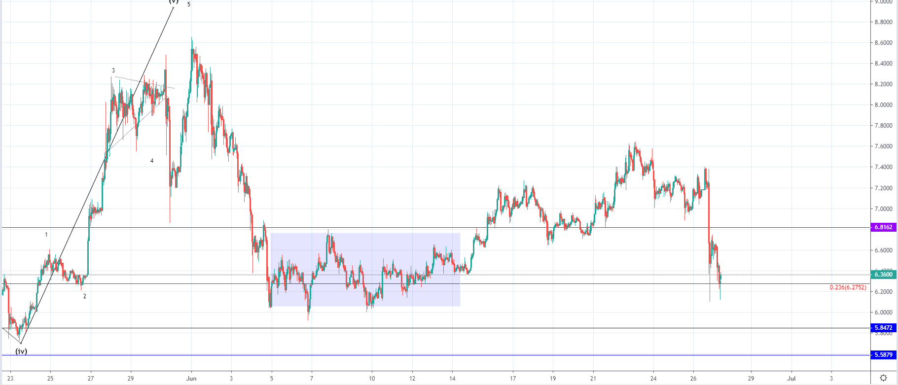 If this is true then the price is set to go below the ending point of the first wave which is at $5.95. The first significant support zone on the way down would be at $5.58.