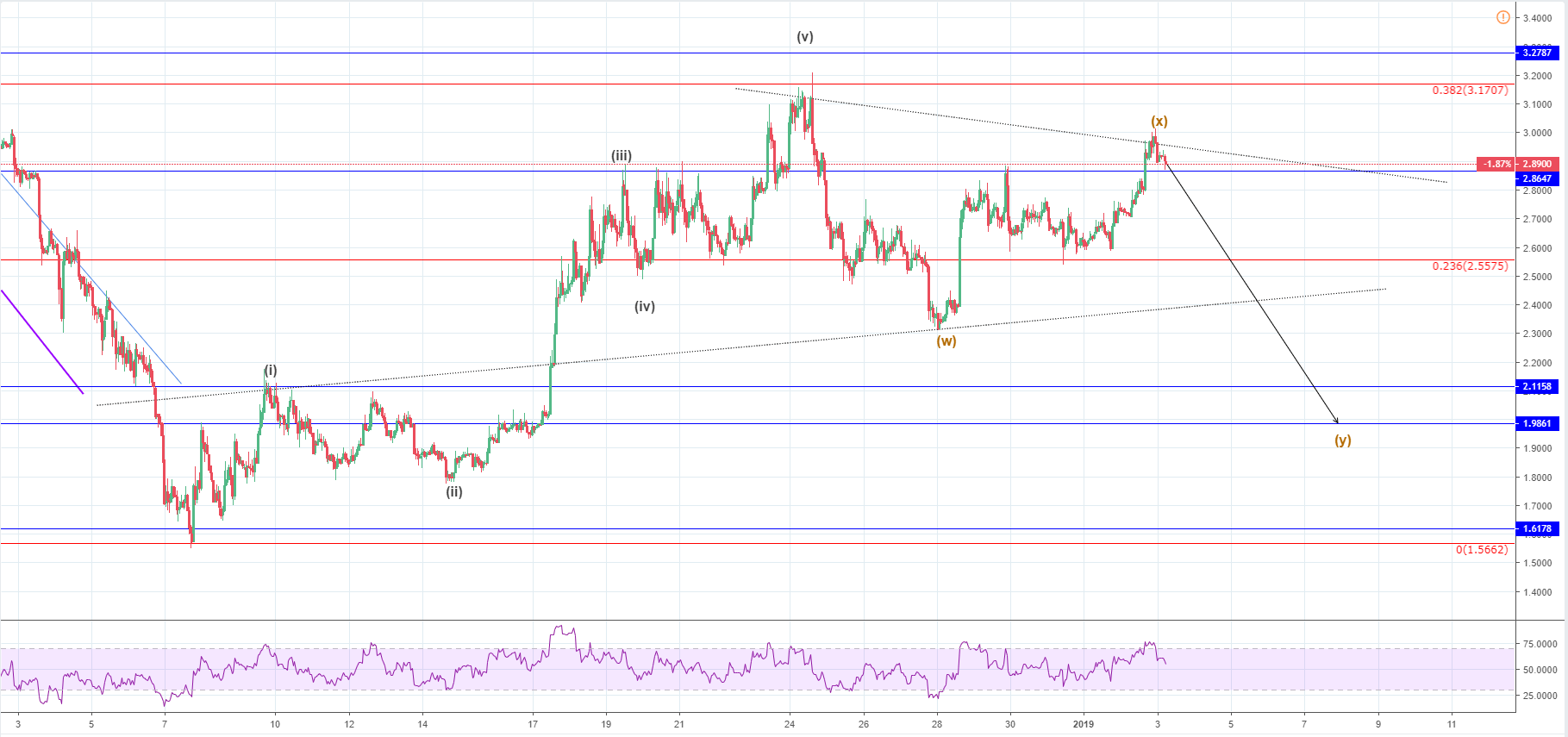 On the hourly chart, a situation is similar to Litecoin as the market is strongly correlated as well as the price action. After an impulsive move, we are now likely to see a correction labeled as a WXY. The current upward move that has likely ended is the X wave from that correction. That means that from here more downside is expected for EOS, but the price target remains unclear with so many possibilities.