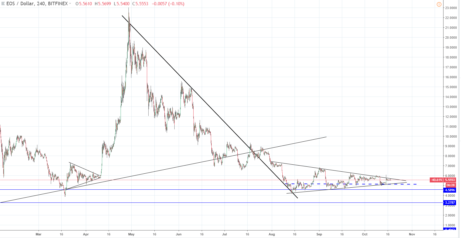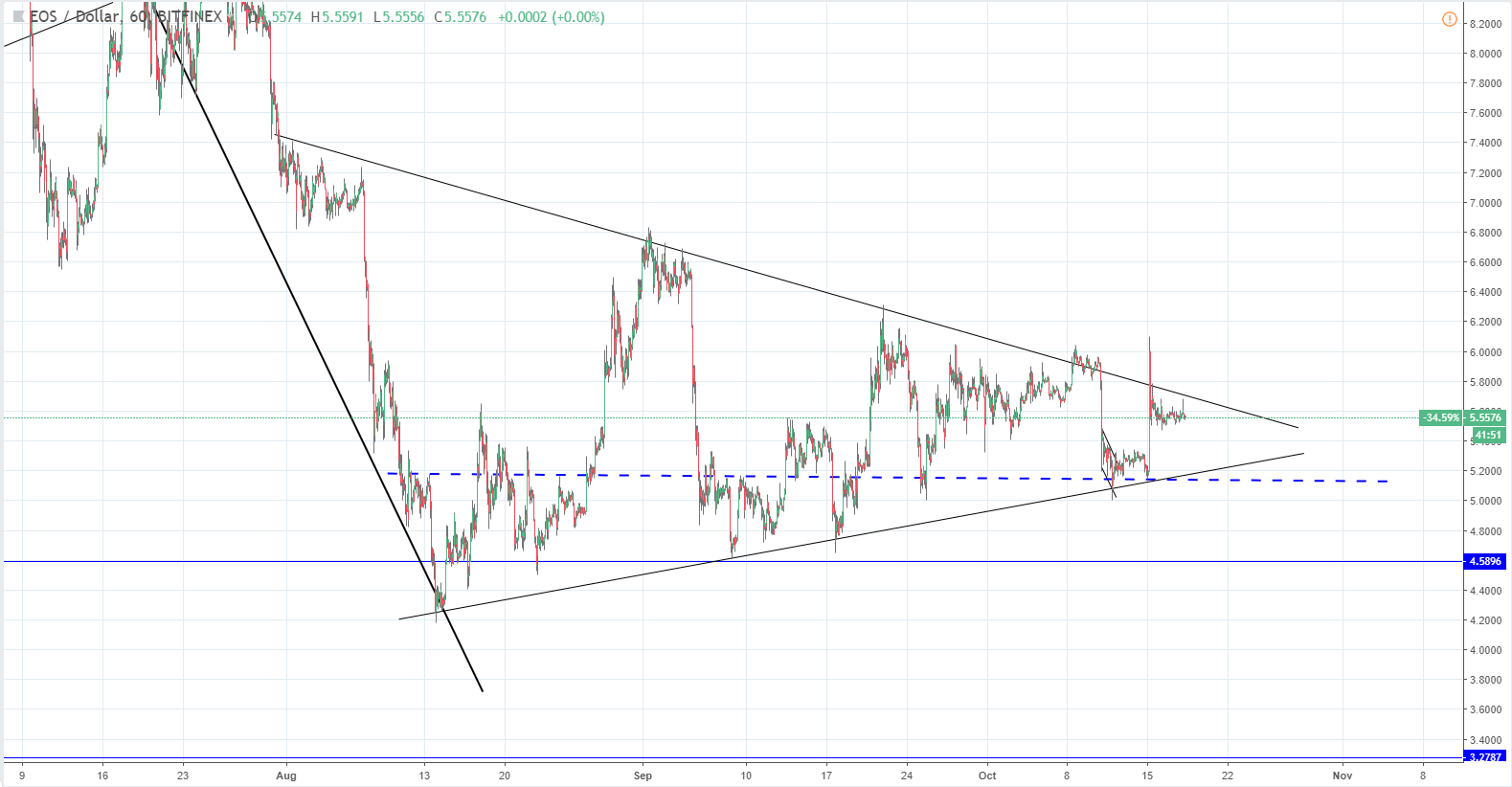 From the levels of Monday’s spike at $6 the price of Eos has fallen by 8.86% and is currently trading at $5.55.