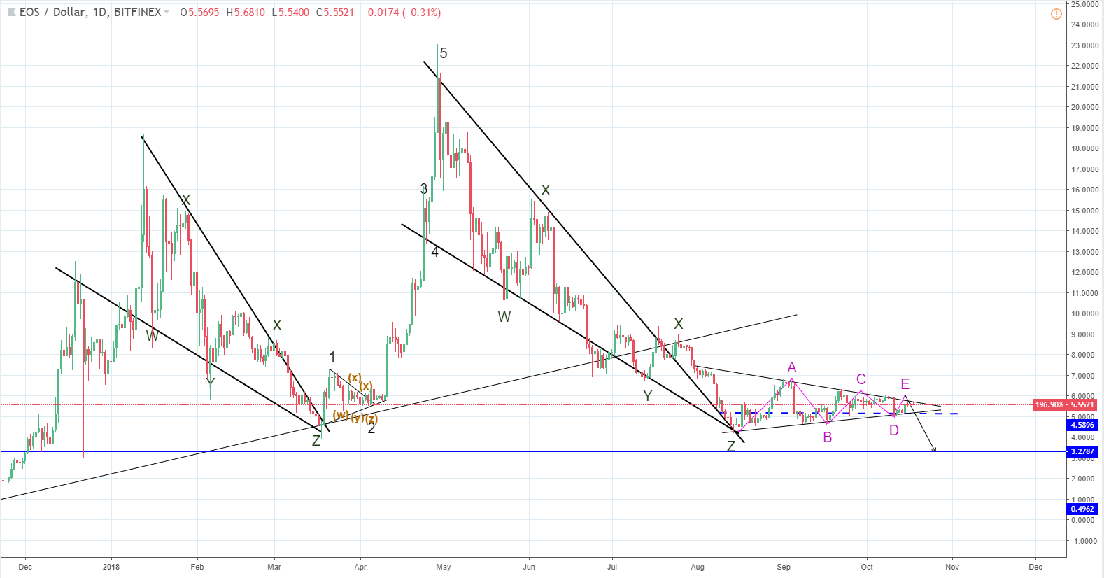 The current triangle, which can be interpreted as a bearish pennant, is not corrective after an impulsive move. It is consolidative after the price decreased by 76% from the all-time high. When the price ends consolidating, which is going to happen very soon, a trend continuation will occur pushing the price lower at least around to $4.5. But my target is on the next horizontal support level at $3.27.