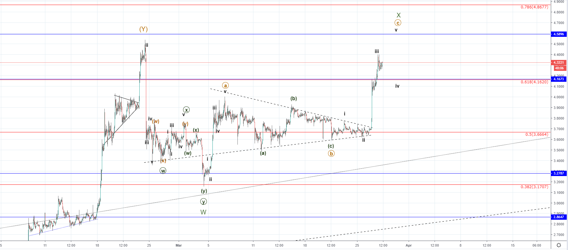Looking at the hourly chart, you can see that the price of EOS went above the 0.618 Fibonacci level which served as strong resistance pointing to strong momentum but still hasn’t exceeded the prior high at around $4.5 level. This movement was expected as the C wave out of the second three wave correction to the upside was to start developing and now it looks like there is still more room to go before the increase ends.