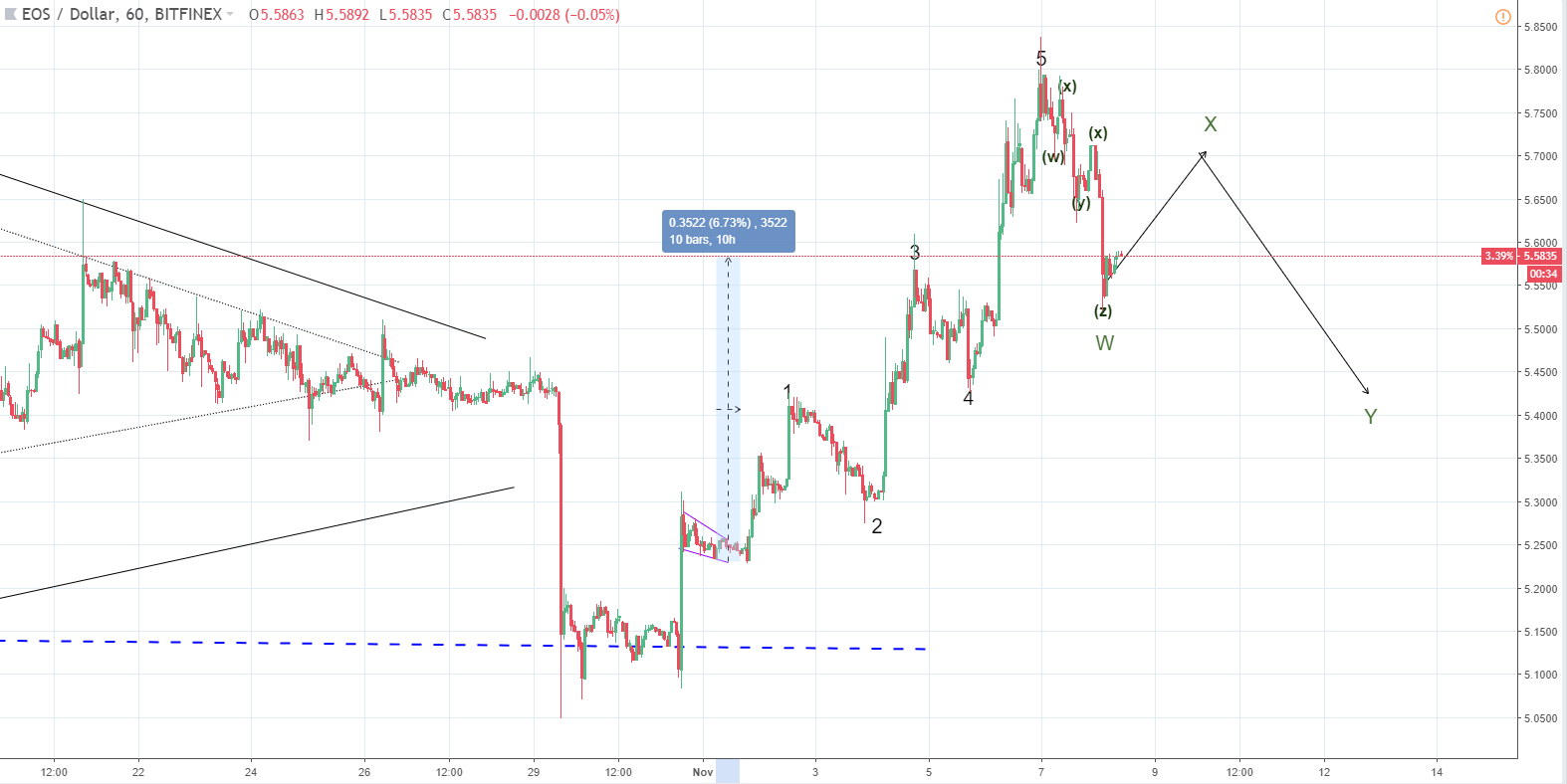 If, however, the impulse wave was motive and in the case of EOS a breakout from the descending triangle than more upside should be expected in the upcoming period as the current correction could only be a minor stop on the three wave before another motive wave occures.