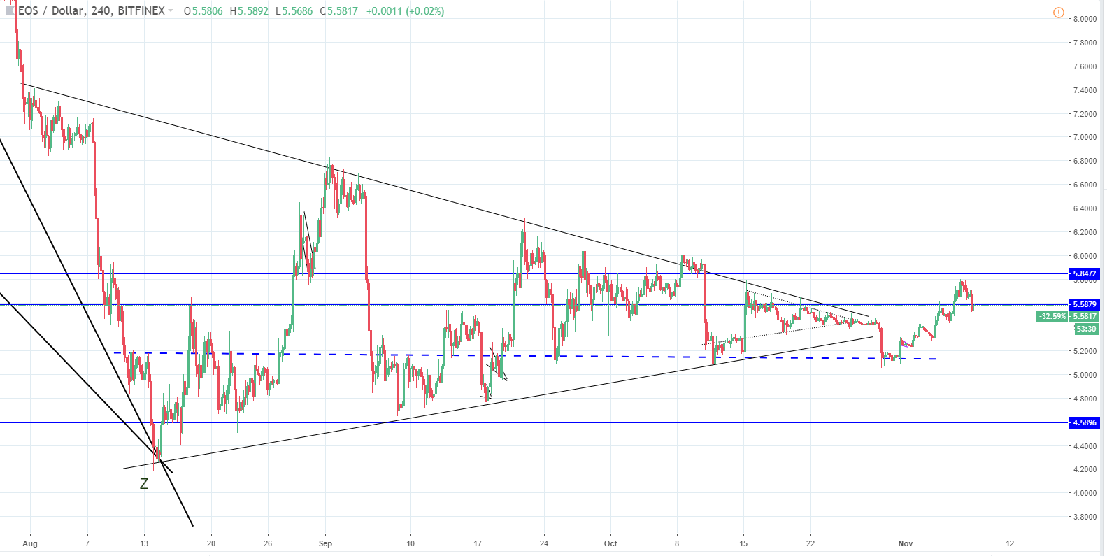 Since last Thursday when the price of EOS was at around $5.22 the cryptocurrency has experienced an increase of 6.73% measured to the current level of $5.579.