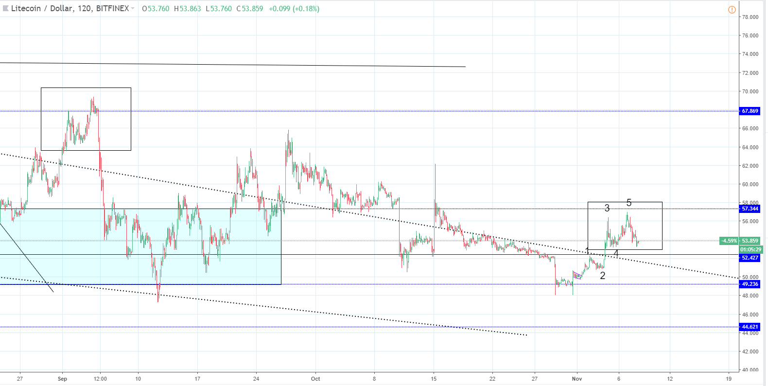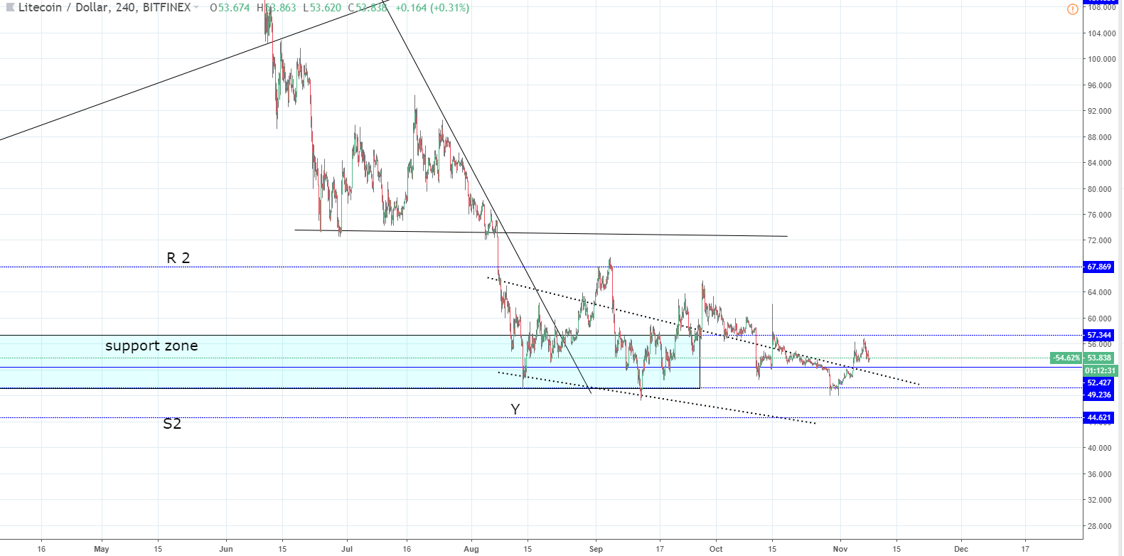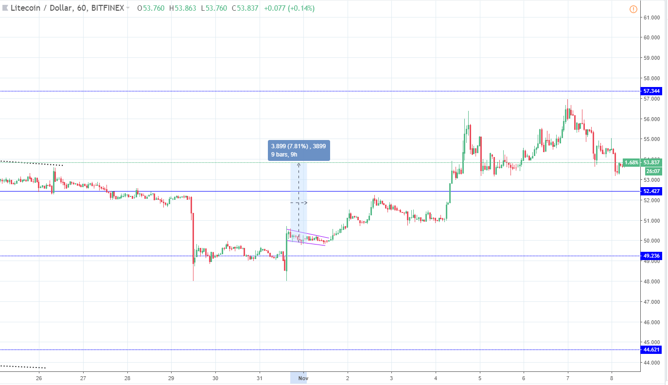 Since the last week’s analysis on 1th of November, the price of Litecoin has increased by 7.81% measured from the open at $49.88 to the levels the cryptocurrency is currently being traded at $53.83.