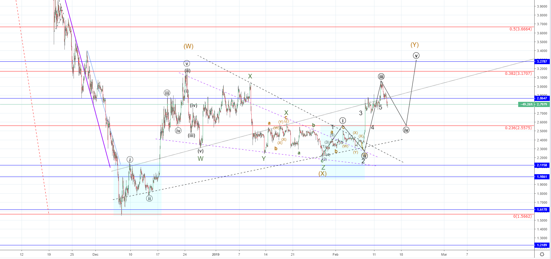 The current increase would be the wave Y out of that count, but as you can see most likely the increase hasn’t ended as I have counted only 4 waves with the current retracement being the 4th. The price could go back to the $35.5 where the ending point of the first wave is before continuing its upward trajectory for another high above the previous one at $48. However I don’t believe that the price is going lower than the still unconfirmed minor descending trendline, which was broken on the way up which would be around $37.9.
