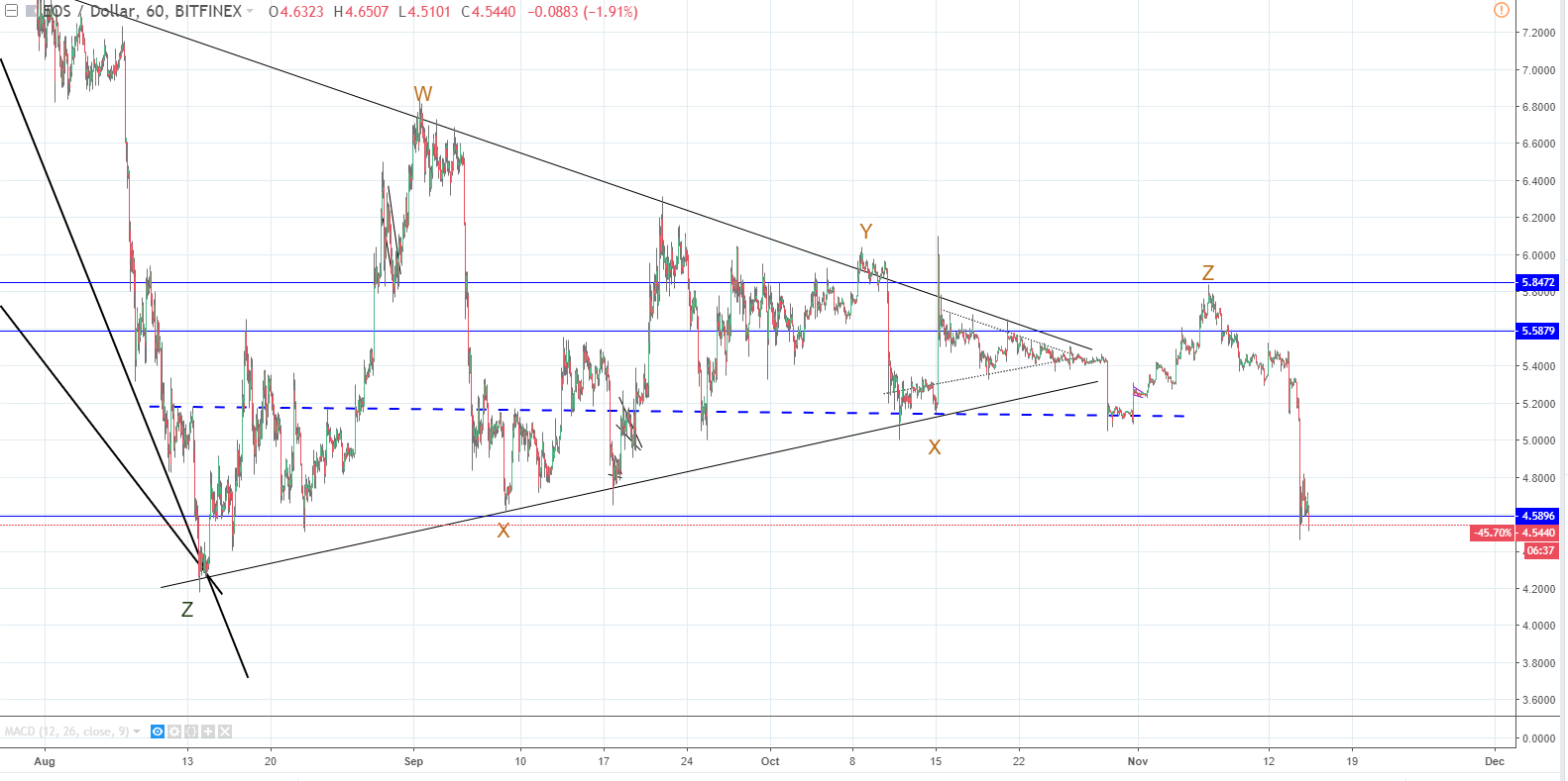 If the EOS/USD pair breaks the current support level (and the price has already been below it on the last Z wave and is currently below it), the next strong enough horizontal support level is at 3.27$.