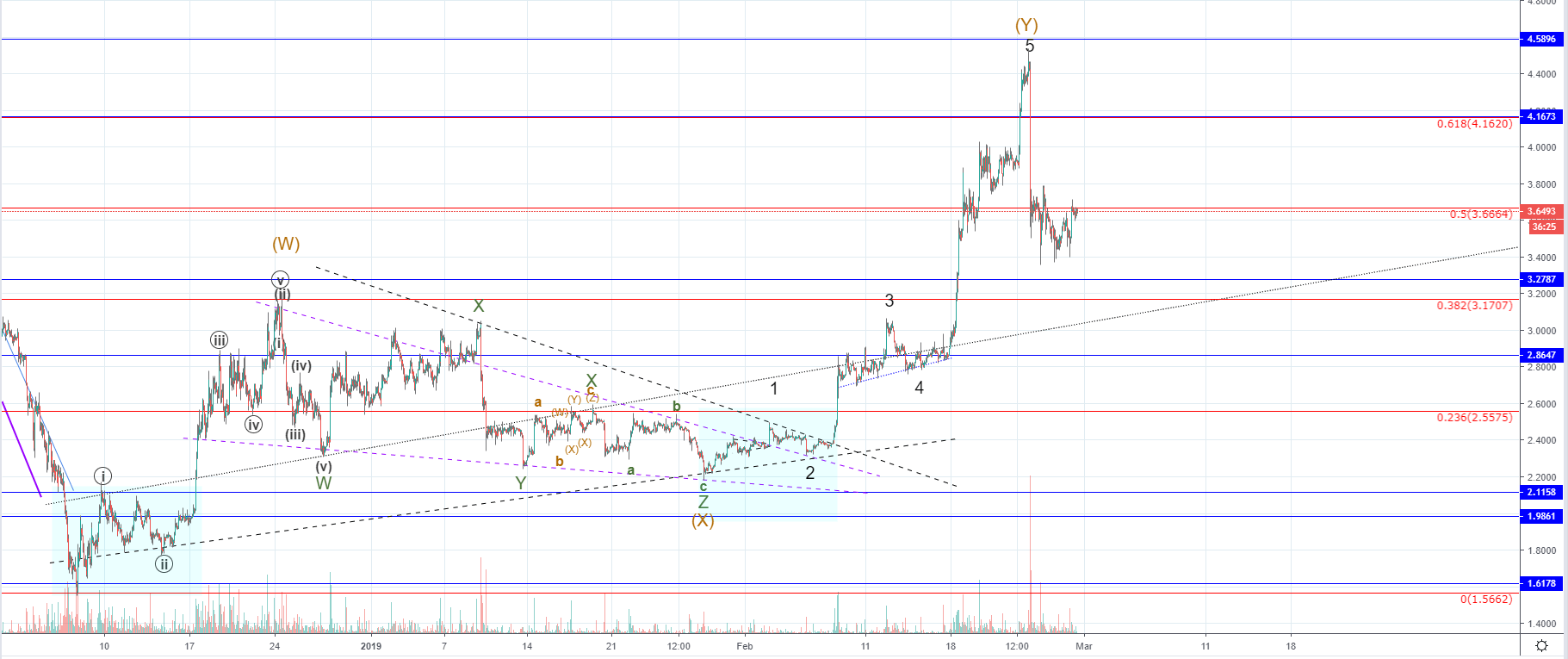 On the hourly chart, you can see that the 5 impulse wave to the upside has ended, so a retracement has expected to play out. The price came up to the horizontal support level. It now served as resistance at $4.5896 for an interaction which ended as a rejection, not because the level serves as strong resistance but because the price increased by over 104% from the start of the second impulse and the first minor resistance encountered triggered its end.