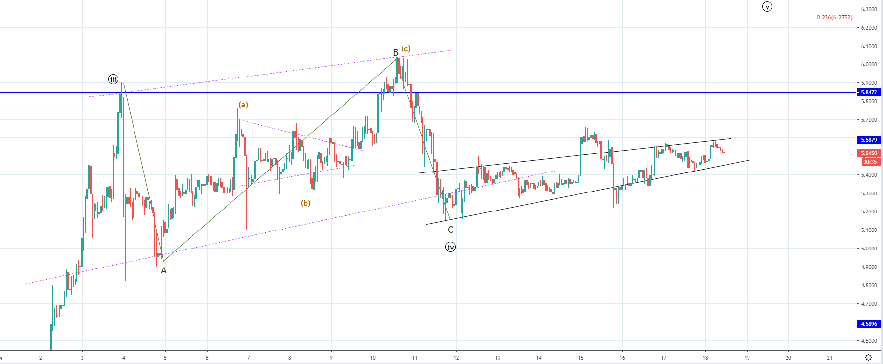 The retest ended as another third rejection which could be the final one before we see a breakout to the downside and a continuation of the mentioned three-wave correction. But it could also be some consolidative price action before the 5th wave impulse to the upside starts. This is why the significant pivot point would be at the mentioned horizontal resistance level at around $5.58. And if the price manages to come above it the bullish scenario would be in play.