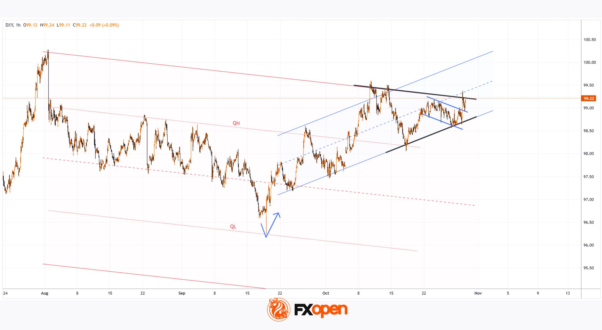 → The long-term downward channel (shown in red) remains relevant, divided into quarters by the intermediate QL and QH lines.