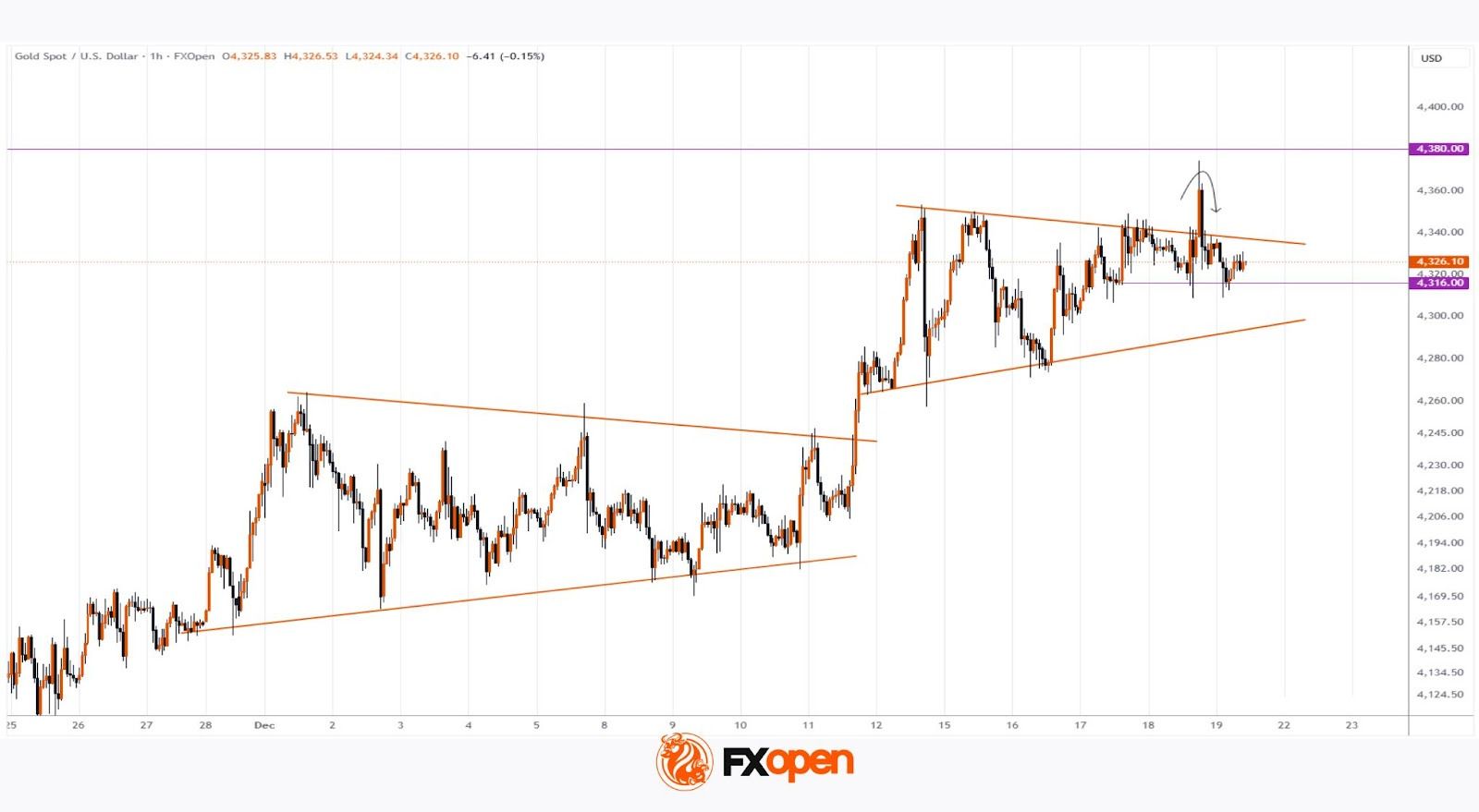 Such a volatility surge materialised on 11–12 December, when gold broke out of the triangle and posted a high near $4,340.