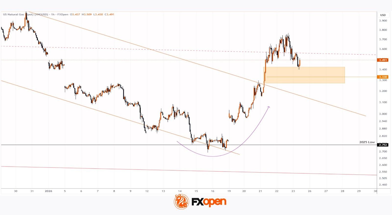 When analysing gas prices on 15 January, we identified a long-term descending channel, highlighted in red on the chart. At that time, we also: