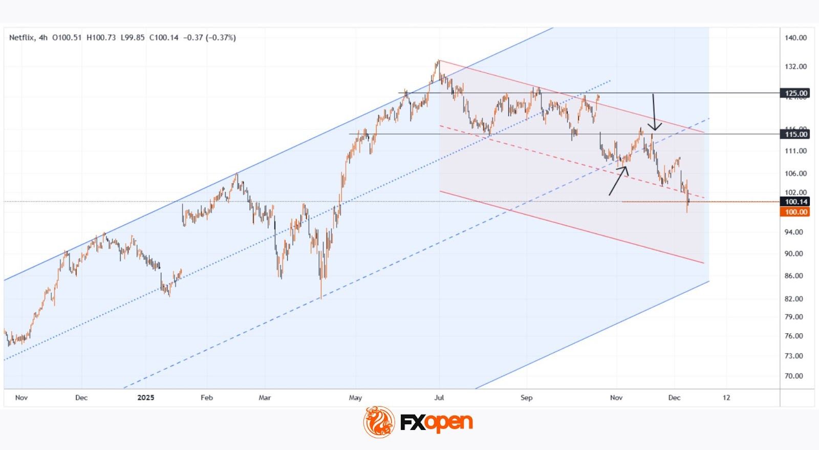 In mid-November, Netflix (NFLX) carried out a stock split – traditionally viewed as a bullish signal for retail investors. Splits typically make shares more affordable and often lift prices on expectations of fresh liquidity. However, the share price moved lower instead (as indicated by arrow 2).