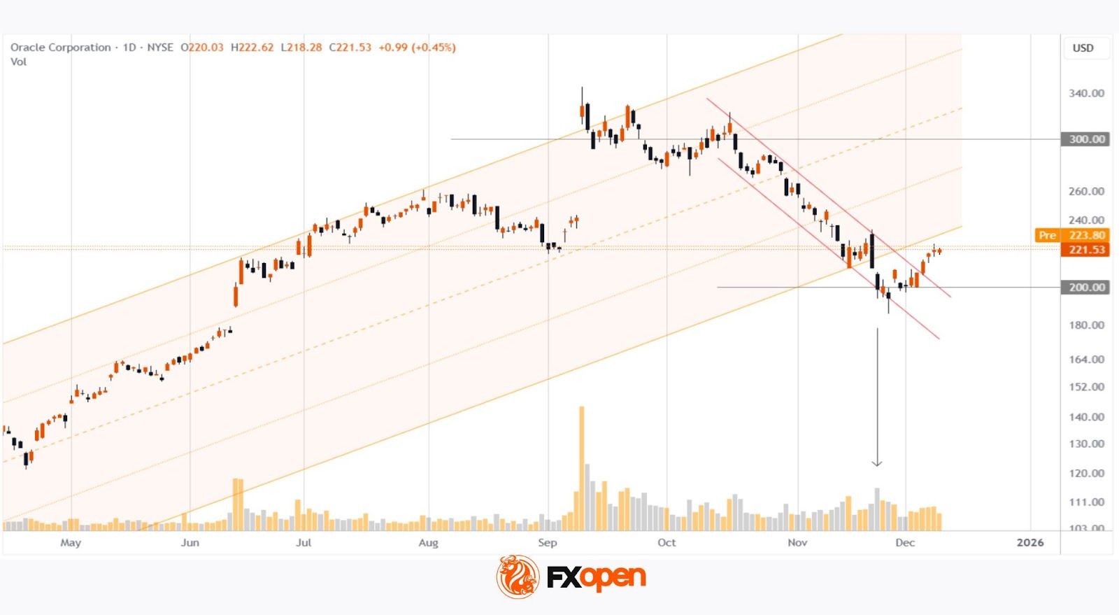On 15 September, we noted that ORCL shares surged with a bullish gap above the psychological $300 level. Since then, however, the share price has fallen by more than 30%. One possible explanation is that “smart money” used the spike in speculative demand to lock in profits on long positions — a view supported by exceptionally high trading volumes. Once demand faded, the price moved lower within a descending channel.