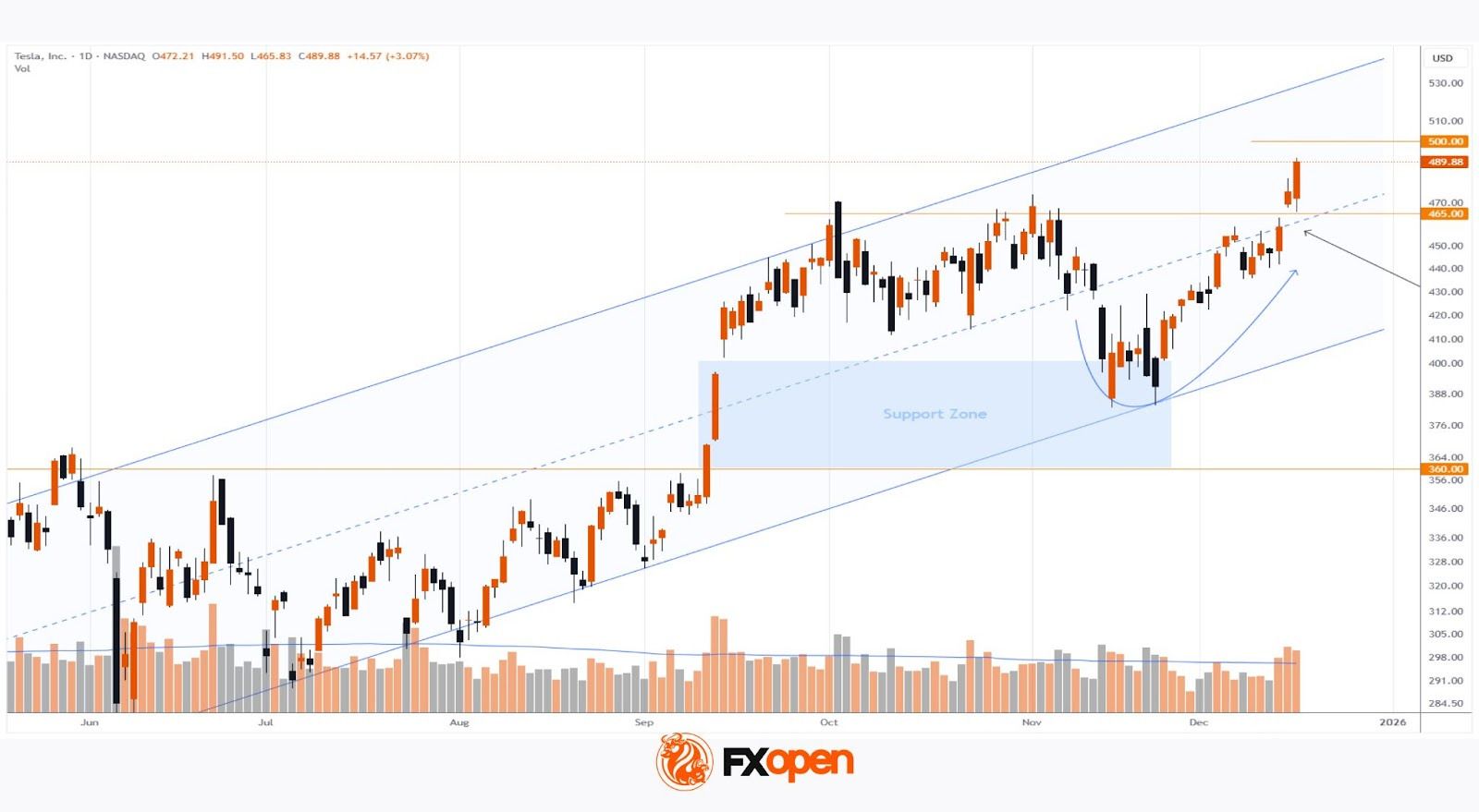 On Tuesday, 16 December 2025, Tesla shares closed at a new all-time high, breaking above the $488 level.