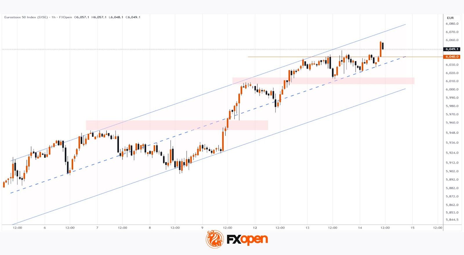 As the charts show, the Euro Stoxx 50 price (Europe 50 on FXOpen) climbed above 6,055 points today, thereby setting a new all-time high.