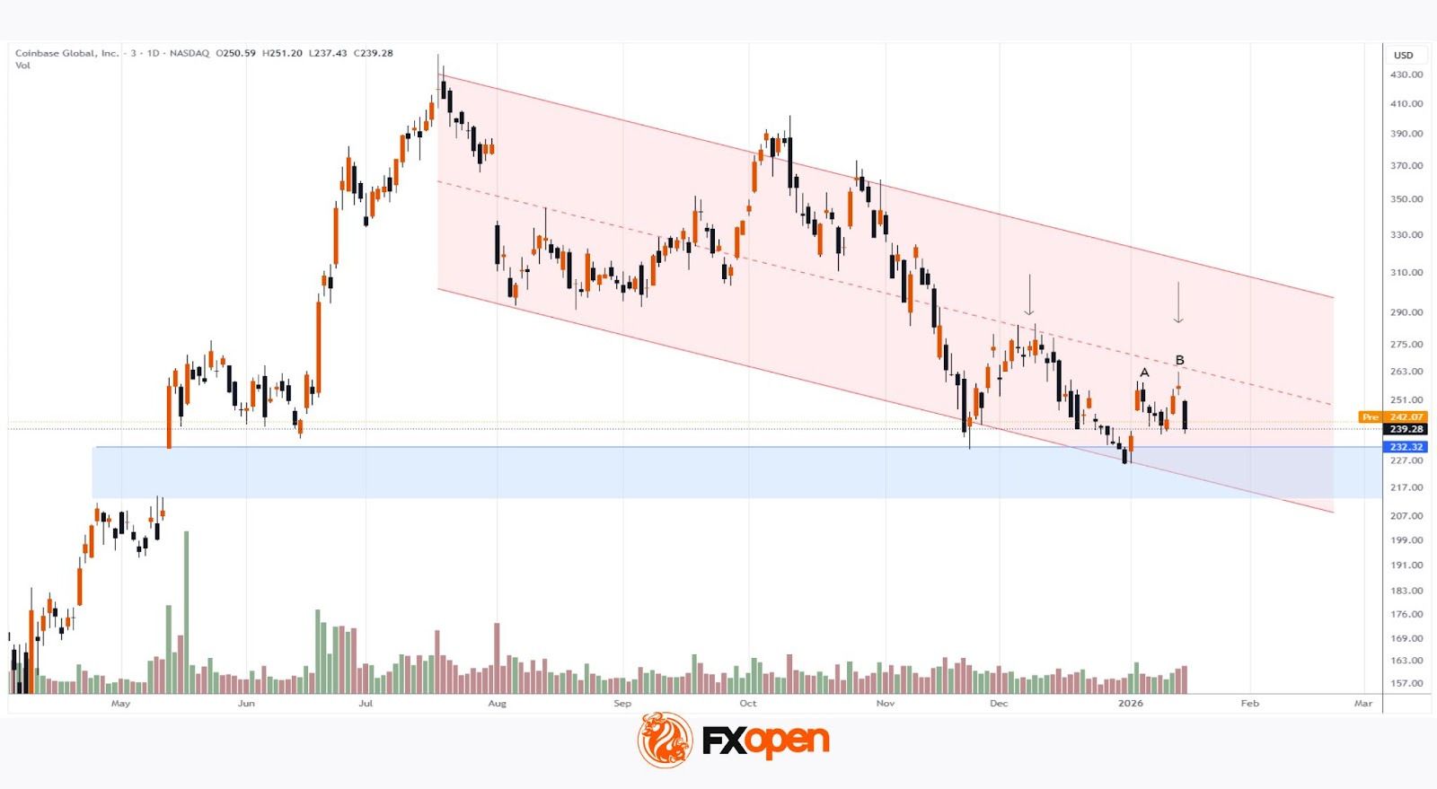 Today, COIN is trading near an important support area around $232.32, formed by a bullish gap from May last year. This could offer some hope to buyers and slow the decline within the channel. However, a strong upside reversal appears unlikely if the fundamental backdrop continues to disappoint cryptocurrency market participants.