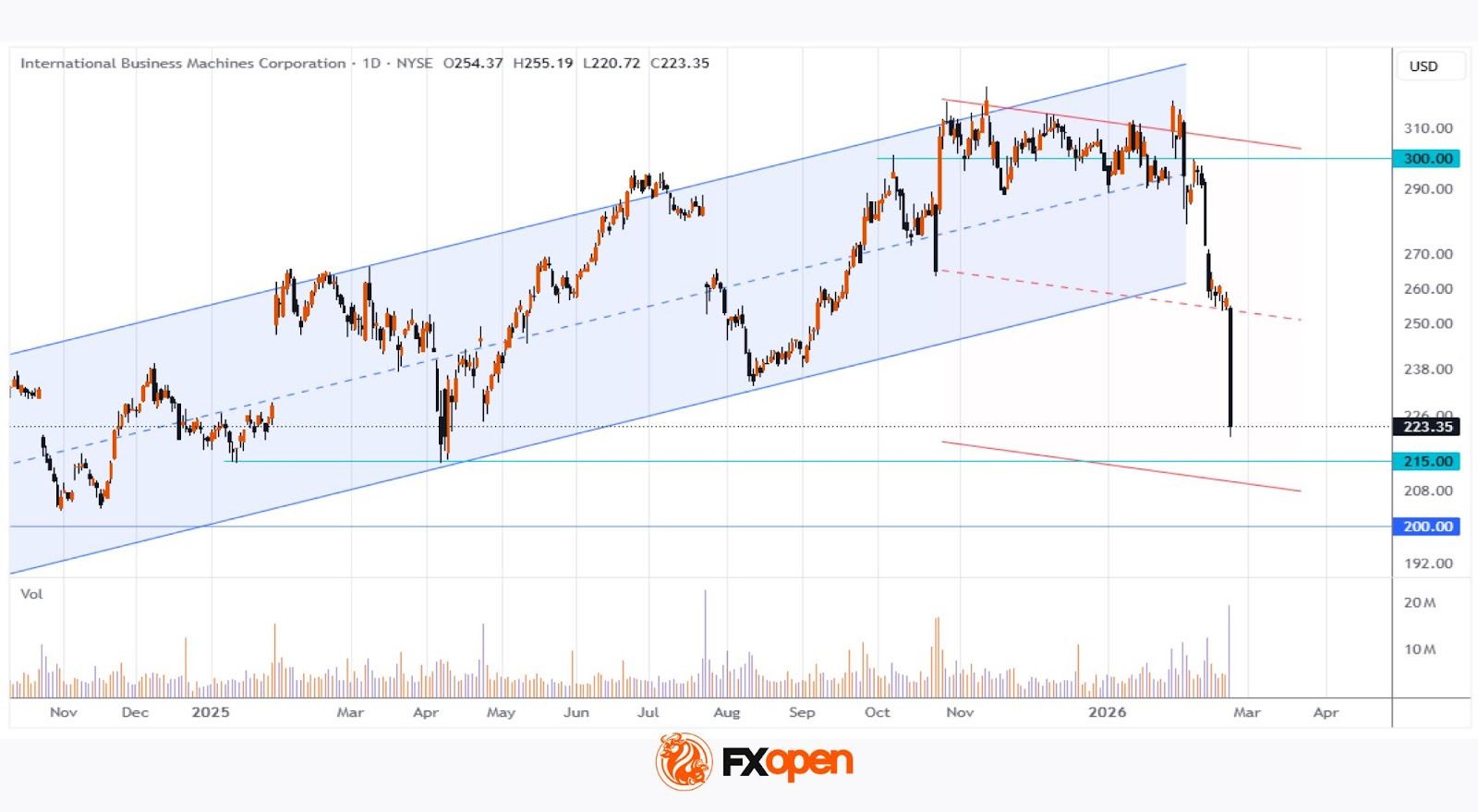 Throughout 2025, IBM stock traded within an ascending channel, but the psychological $300 level proved to be strong resistance. The price attempted to secure a foothold above it for several months, without success. The earnings release on 28 January turned into a bull trap and marked the beginning of an extraordinary sell-off, accompanied by rising volume on bearish candles — a sign of market weakness.