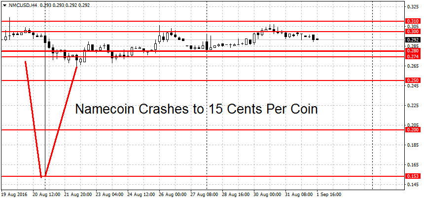 Namecoin has been under pressure for several weeks, slowly drifting down to the 27-28 cents support area. Two weeks ago we identified these levels as important support. It’s not a surprise that as soon as this support was broken, prices flash-crashed to $0.153 dollars per coin. It’s likely that there were lots of stop orders right below here because like we said on August 18 last year’s low is at $0.274 and ‘a decisive clearing of this support area would switch the long-term trend to the downside as well.’