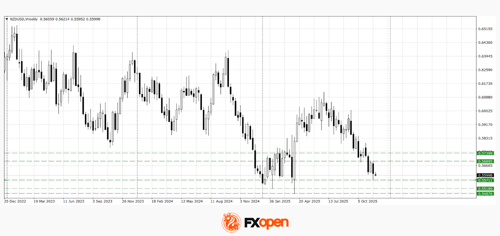 NZD/USD is trading near 0.5600, slightly above the yearly lows of 0.5490–0.5570. If sentiment deteriorates and the RBNZ cuts rates again, the pair may test and break new lows for the year. If it holds above 0.5600, a corrective rise towards 0.5690–0.5740 is possible.