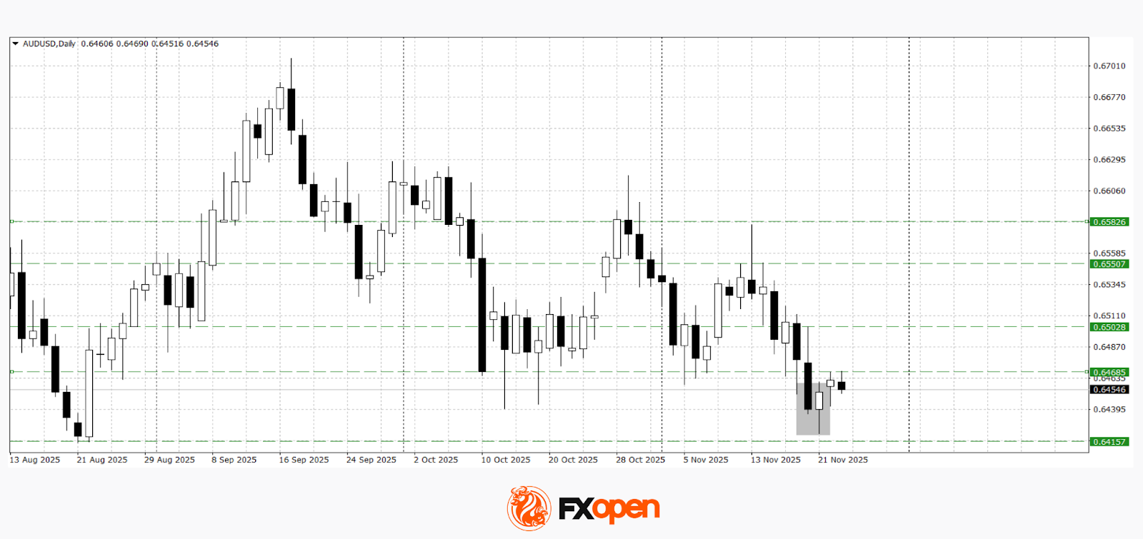 After failing to reach this year’s August lows, AUD/USD reversed upwards, forming a “piercing line” pattern on the daily timeframe. However, the pattern’s follow-through remains weak, with buyers unable to hold above the key 0.6470–0.6500 range. A break above 0.6500 could trigger a corrective rise towards 0.6550–0.6580. A move below last week’s low may resume the medium-term downtrend.