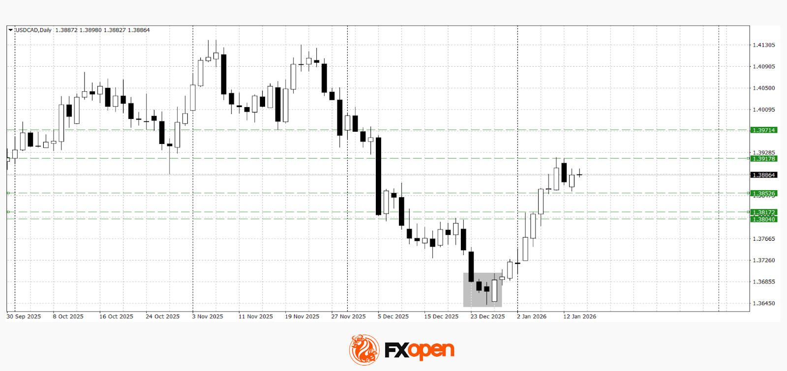 A rebound from support at 1.3600 and the formation of a bullish engulfing pattern in late December pushed the pair higher towards key resistance at 1.3900. At present, the upward momentum is slowing, but if the price holds above 1.3850 in the coming sessions, a renewed test of 1.3900 is possible. A downside break below 1.3850 could trigger a resumption of the downward move towards the 1.3700–1.3600 area.