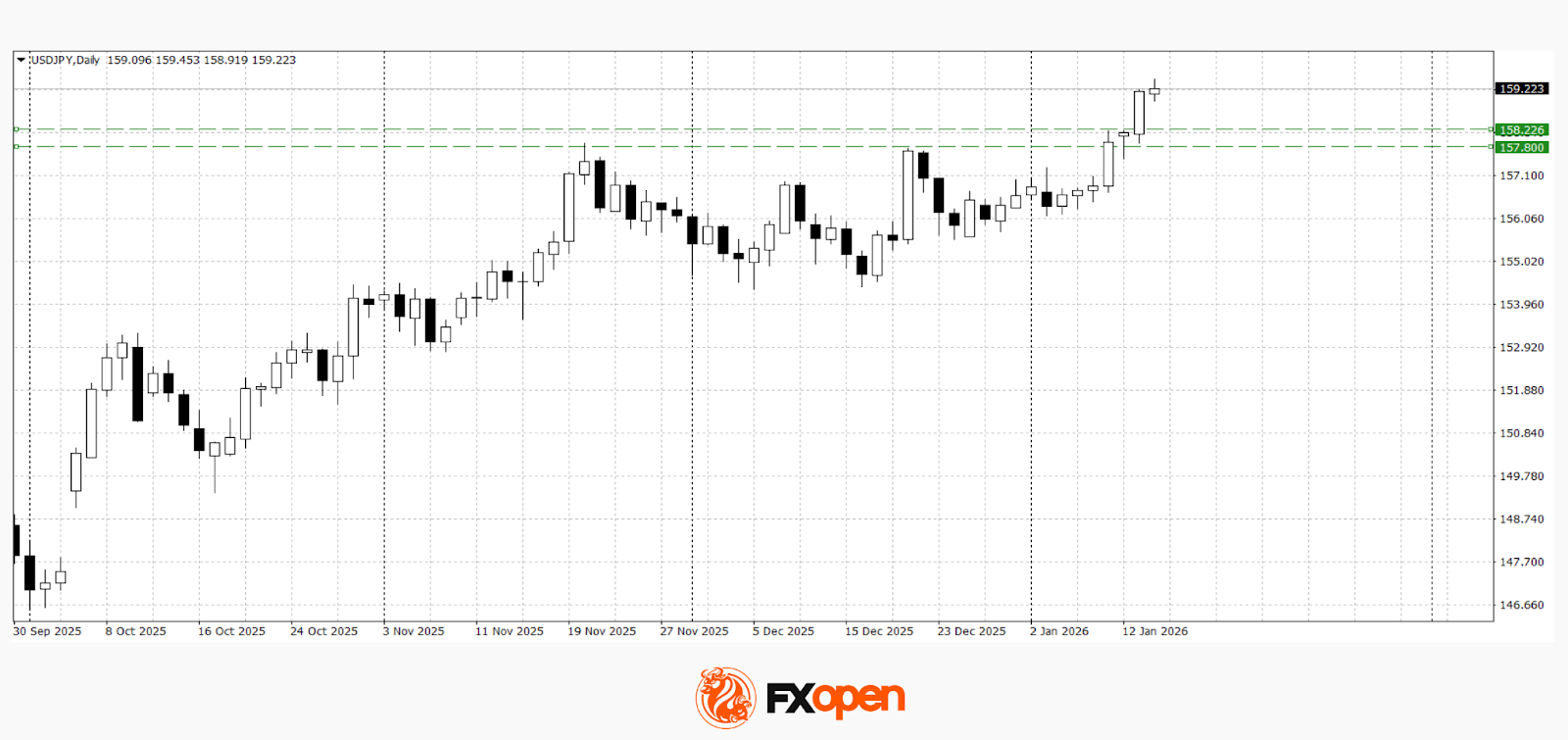 USD/JPY continues to rise as the yen remains under pressure. The Japanese currency has fallen to its weakest levels since July 2024, approaching the 159 per dollar area amid rumours of a possible announcement of snap elections in Japan. The market is pricing in a scenario of strengthened political positions for the Prime Minister and a potential easing of fiscal and monetary policy, which has increased pressure on the yen and boosted speculative activity in the FX market.