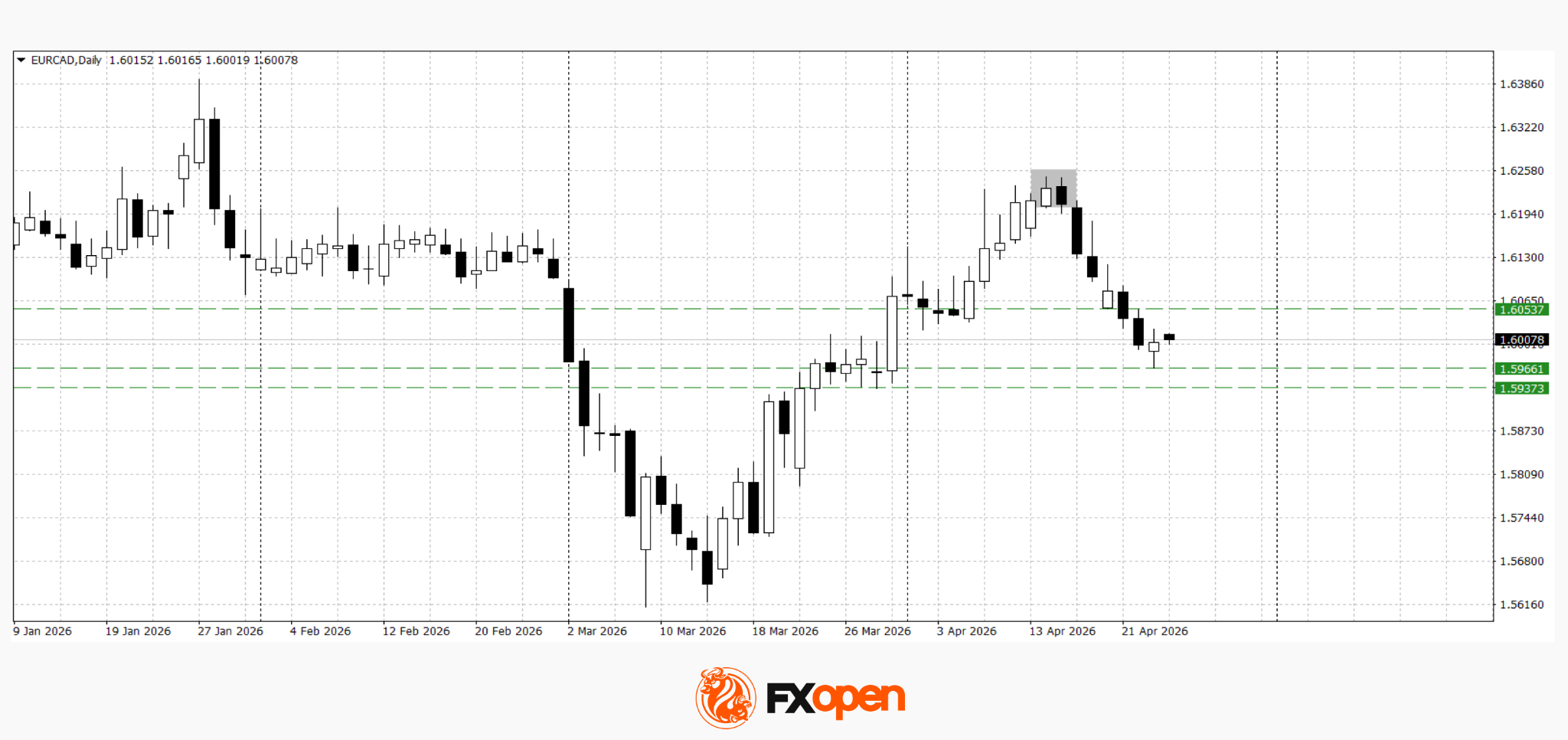 EUR/CAD is also moving lower, testing important levels amid mixed fundamental drivers. Technical analysis points to the possibility of further downside towards 1.6000–1.5940, supported by a confirmed bearish “tweezer” pattern on the daily chart. A move above 1.6050 could bring buyers back into the market.