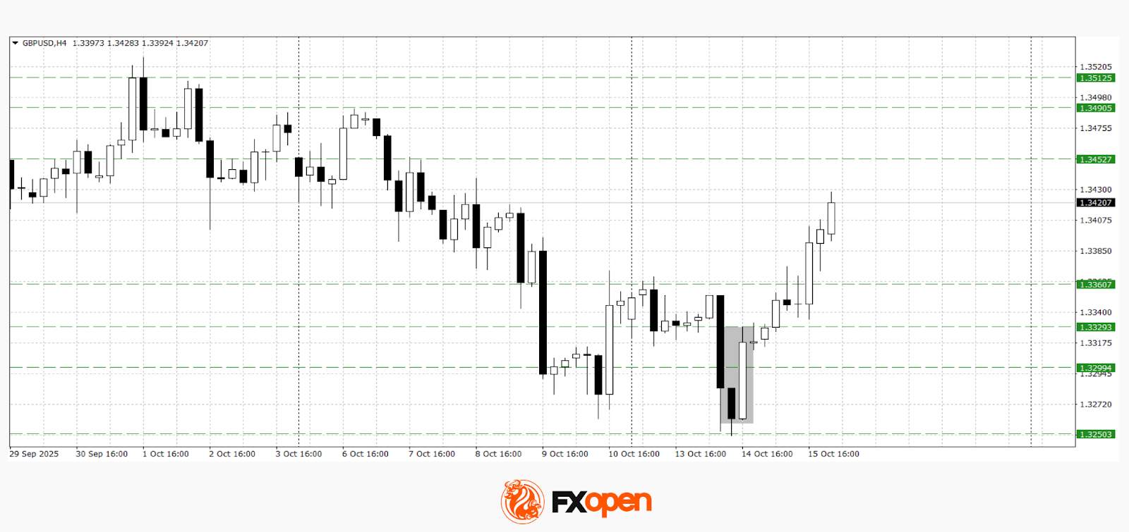 For GBP/USD, the technical outlook remains mixed. As expected, the pair continued its downtrend early in the week, testing the 1.3300–1.3330 range and posting a new October low at 1.3260. On the H4 timeframe, a “bullish engulfing” pattern has formed.