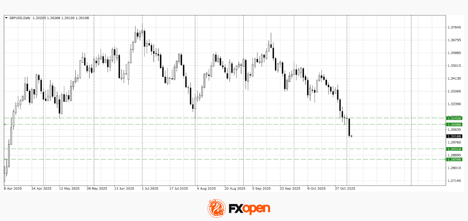 The GBP/USD pair has been falling for the third consecutive week. The key range of 1.3100–1.3140, which had held off sellers for six months, has now been decisively broken. If buyers fail to regain ground above 1.3100 in the near term, the price could continue its downward move towards 1.2850–1.2930.