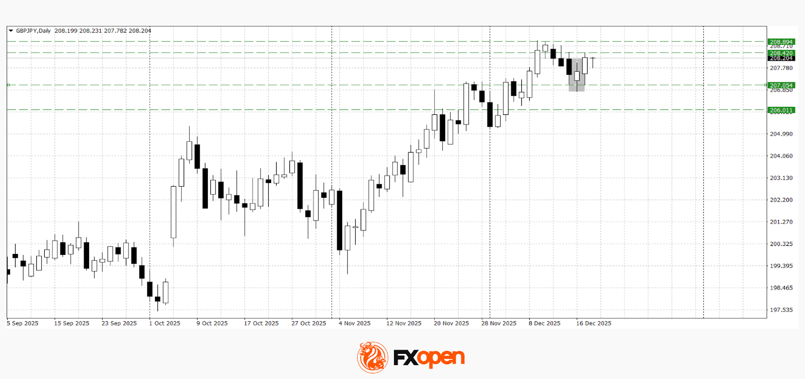 GBP/USD is fluctuating within a narrow range ahead of the announcement, reflecting a balance between pressure on the pound from expected monetary easing and broader market caution before the BoE decision. Consolidation is also evident in GBP/JPY, although the pair remains above key levels around 208.00. Traders are staying cautious ahead of tomorrow’s Bank of Japan meeting, where most forecasts point to a potential 25-basis-point rate hike to 0.75% — a move that would mark a significant shift in Japanese policy.