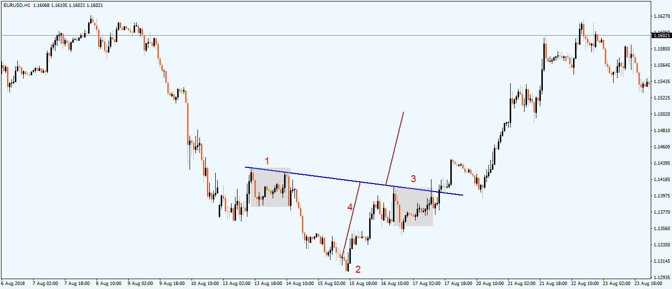 The numbers on the chart above correspond to the head and shoulders pattern. From left to right, during a bearish trend, the market takes a pause and consolidates.