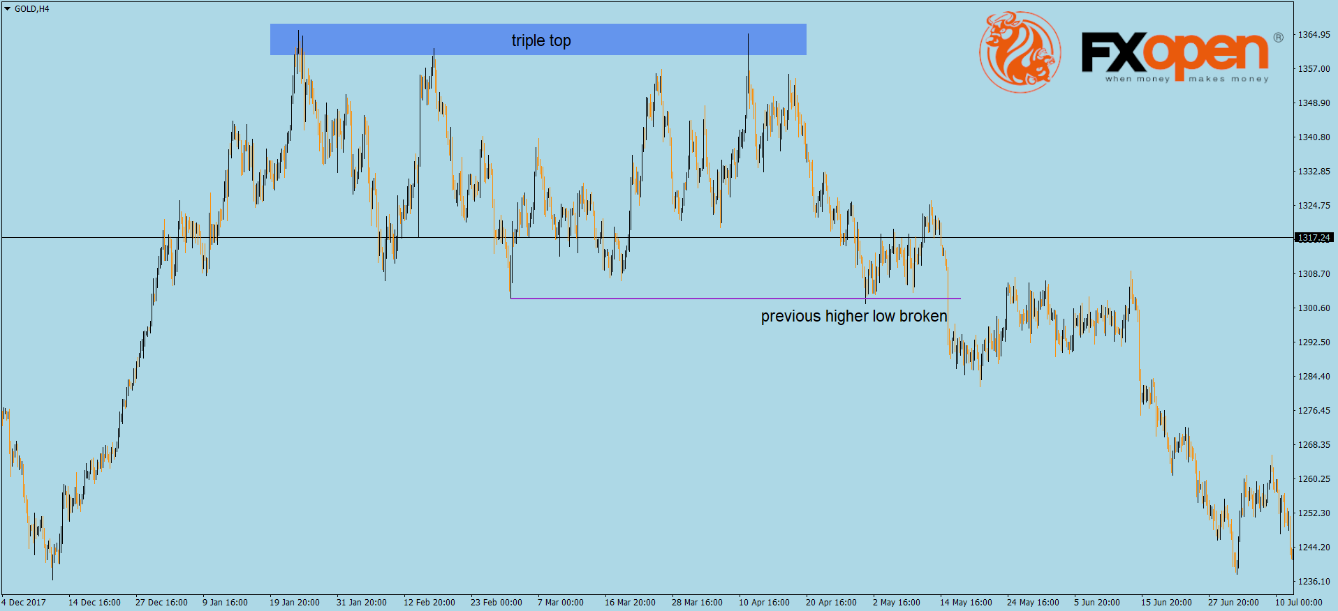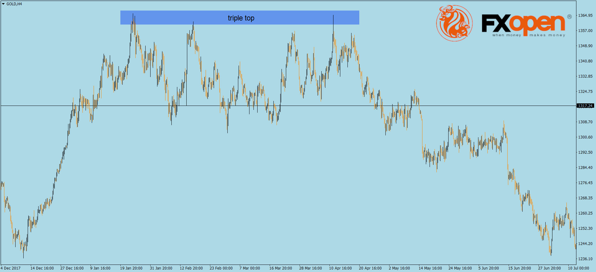 Recently, gold made a triple top. A reversal pattern, it shows the inability of the market to keep advancing.