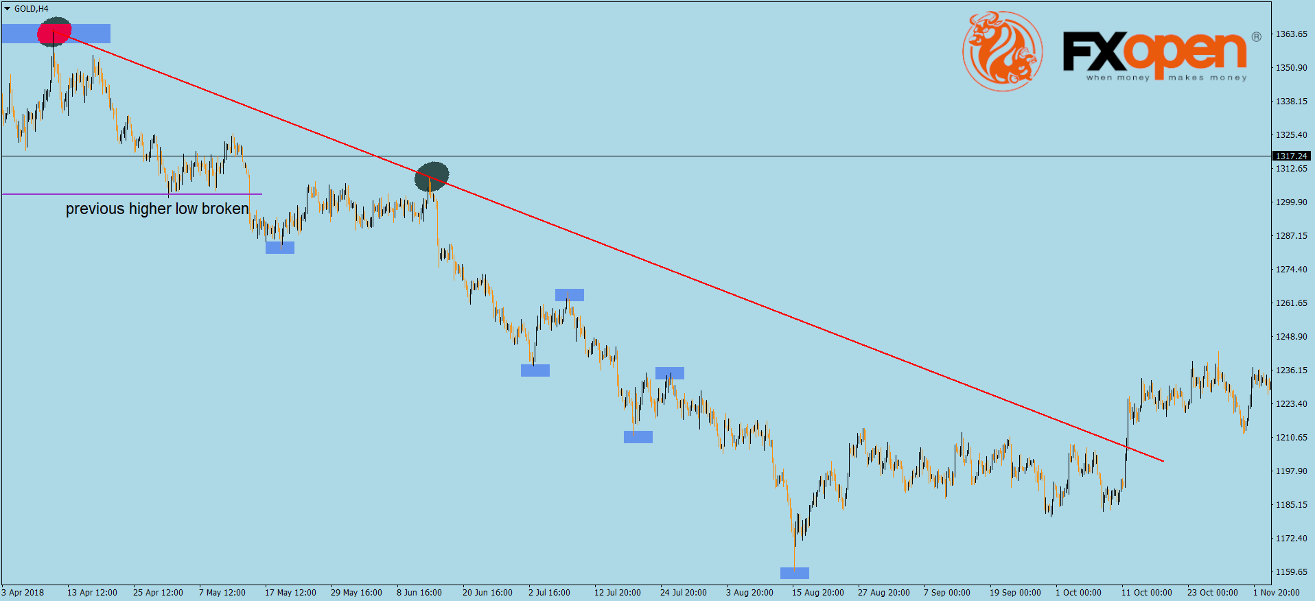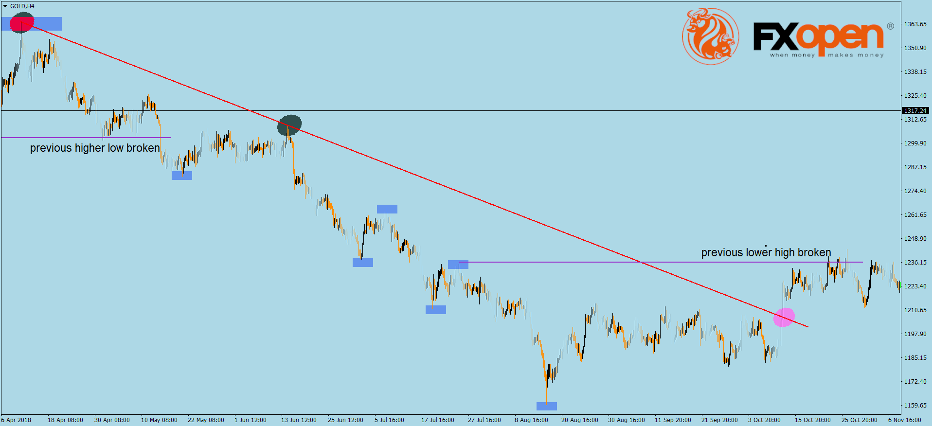 The blue rectangles show the lower lows and lower highs series characteristic of a bearish trend. After the last lower low, the market took some time to consolidate. And finally, it broke the bearish trendline.
