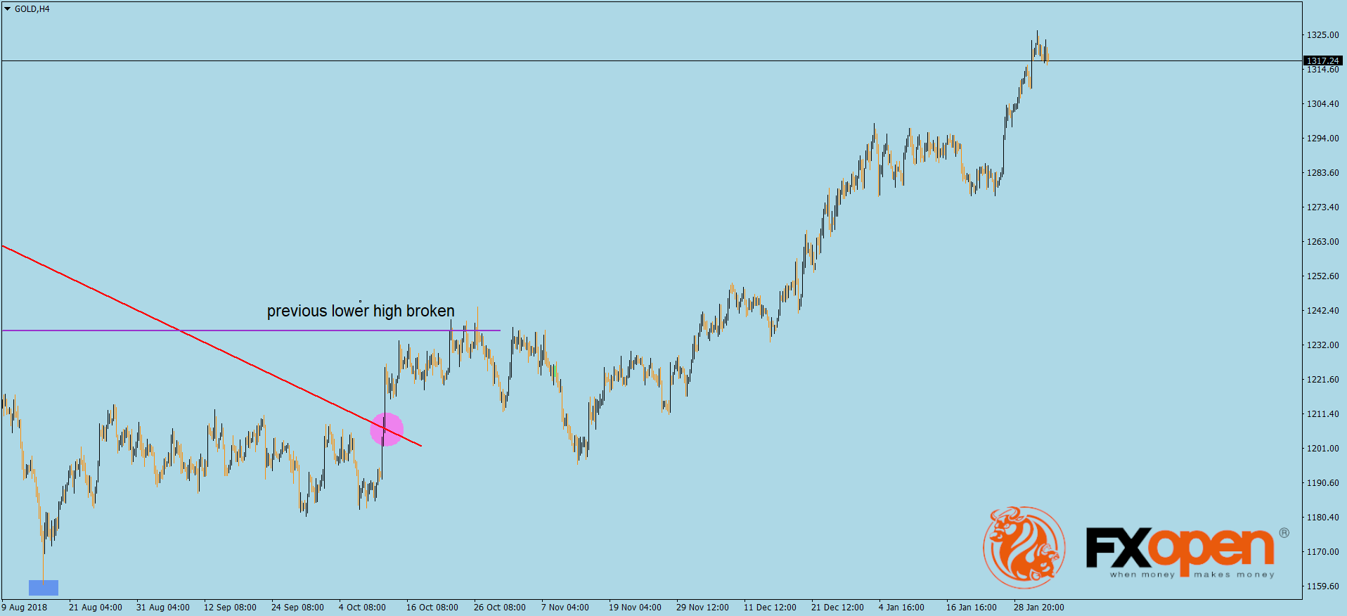 With the bearish trendline broken, traders apply the same rules but this time to trade a bullish trend. The first thing the price should do after breaking the trendline is also to break the previous lower high. It did, signaling the start of a bullish trend.