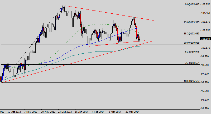 As of this writing, the pair is being traded near 101.58. Support may be seen around 101.33, the low of yesterday ahead of the 101.00 handle that is the 50% fib level as well as long term trendline support. A break and daily closing below the 101.00 support will push the pair into stronger bearish territory, opening doors for further dips below the 100.00 handle.