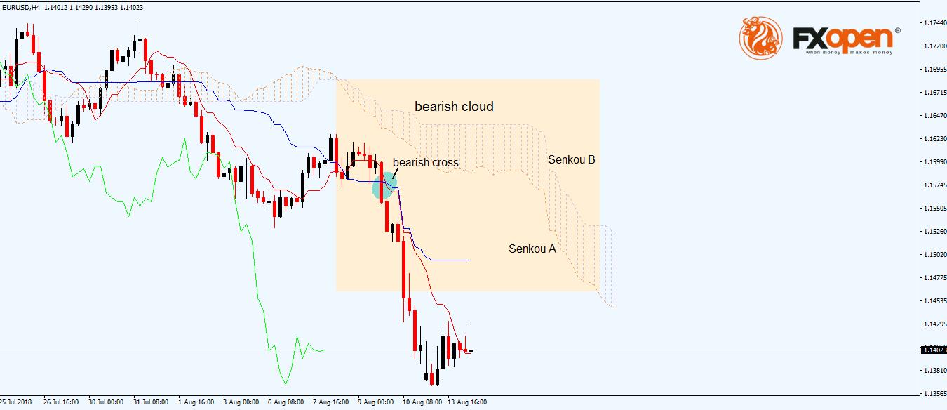 The cloud is the area between two moving averages: Senkou A and Senkou B. When Senkou A crosses above Senkou B, the cloud is bullish and will prove to be solid support on any future dips. Consequently, a bearish cloud has the Senkou A below Senkou B, and traders will sell potential spikes into it.